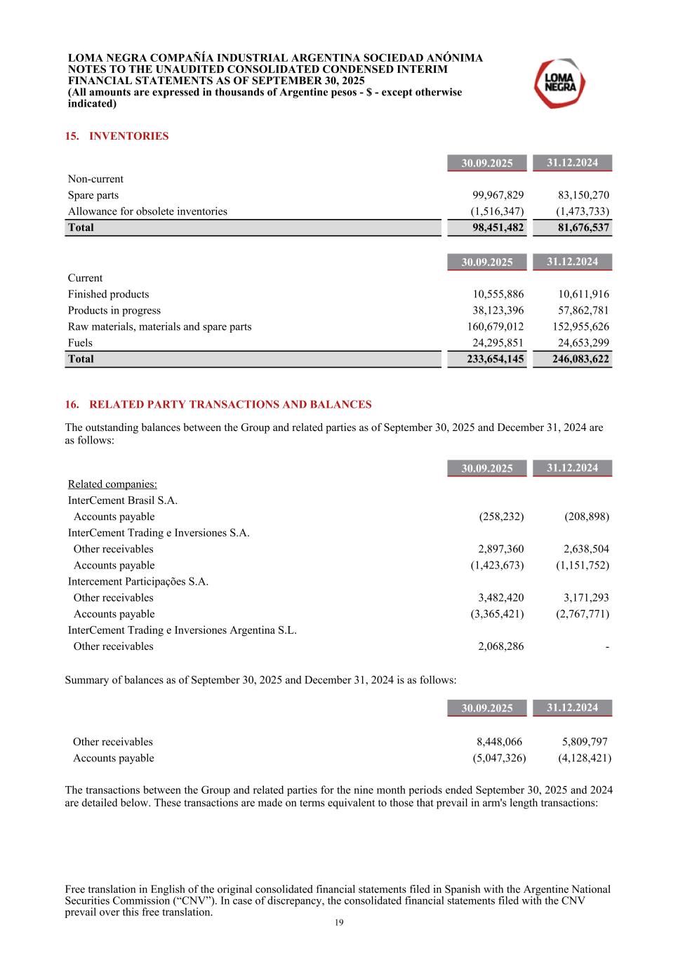 15. INVENTORIES 30.09.2025 31.12.2024 Non-current Spare parts 99,967,829 83,150,270 Allowance for obsolete inventories (1,516,347) (1,473,733) Total 98,451,482 81,676,537 30.09.2025 31.12.2024 Current Finished products 10,555,886 10,611,916 Products in progress 38,123,396 57,862,781 Raw materials, materials and spare parts 160,679,012 152,955,626 Fuels 24,295,851 24,653,299 Total 233,654,145 246,083,622 16. RELATED PARTY TRANSACTIONS AND BALANCES The outstanding balances between the Group and related parties as of September 30, 2025 and December 31, 2024 are as follows: 30.09.2025 31.12.2024 Related companies: InterCement Brasil S.A. Accounts payable (258,232) (208,898) InterCement Trading e Inversiones S.A. Other receivables 2,897,360 2,638,504 Accounts payable (1,423,673) (1,151,752) Intercement Participações S.A. Other receivables 3,482,420 3,171,293 Accounts payable (3,365,421) (2,767,771) InterCement Trading e Inversiones Argentina S.L. Other receivables 2,068,286 - Summary of balances as of September 30, 2025 and December 31, 2024 is as follows: 30.09.2025 31.12.2024 Other receivables 8,448,066 5,809,797 Accounts payable (5,047,326) (4,128,421) The transactions between the Group and related parties for the nine month periods ended September 30, 2025 and 2024 are detailed below. These transactions are made on terms equivalent to those that prevail in arm's length transactions: LOMA NEGRA COMPAÑÍA INDUSTRIAL ARGENTINA SOCIEDAD ANÓNIMA NOTES TO THE UNAUDITED CONSOLIDATED CONDENSED INTERIM FINANCIAL STATEMENTS AS OF SEPTEMBER 30, 2025 (All amounts are expressed in thousands of Argentine pesos - $ - except otherwise indicated) Free translation in English of the original consolidated financial statements filed in Spanish with the Argentine National Securities Commission (“CNV”). In case of discrepancy, the consolidated financial statements filed with the CNV prevail over this free translation. 19
