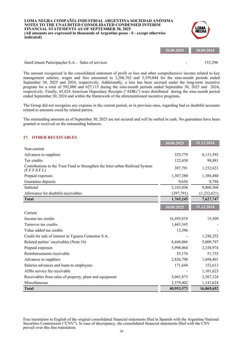 30.09.2025 30.09.2024 InterCement Participações S.A. – Sales of services - 153,298 The amount recognized in the consolidated statement of profit or loss and other comprehensive income related to key management salaries, wages and fees amounted to 3,206,762 and 3,359,044 for the nine-month periods ended September 30, 2025 and 2024, respectively. Additionally, a loss has been accrued under the long-term incentive program for a total of 592,000 and 627,115 during the nine-month periods ended September 30, 2025 and 2024, respectively. Finally, 65,624 American Depositary Receipts (“ADRs”) were distributed during the nine-month period ended September 30, 2024 and within the framework of the aforementioned incentive programs. The Group did not recognize any expense in the current period, or in previous ones, regarding bad or doubtful accounts related to amounts owed by related parties. The outstanding amounts as of September 30, 2025 are not secured and will be settled in cash. No guarantees have been granted or received on the outstanding balances. 17. OTHER RECEIVABLES 30.09.2025 31.12.2024 Non-current Advances to suppliers 325,779 6,131,592 Tax credits 122,430 98,881 Contributions to the Trust Fund to Strengthen the Inter-urban Railroad System (F.F.F.S.F.I.) 397,791 1,232,621 Prepaid expenses 1,307,380 1,388,480 Guarantee deposits 9,656 8,794 Subtotal 2,163,036 8,860,368 Allowance for doubtful receivables (397,791) (1,232,621) Total 1,765,245 7,627,747 30.09.2025 31.12.2024 Current Income tax credits 16,595,819 15,509 Turnover tax credits 1,443,343 - Value added tax credits 13,396 - Credit for sale of interest in Yguazu Cementos S.A. - 1,256,252 Related parties’ receivables (Note 16) 8,448,066 5,809,797 Prepaid expenses 5,998,064 2,338,974 Reimbursements receivable 35,176 51,735 Advances to suppliers 2,826,790 1,694,401 Salaries advances and loans to employees 171,644 152,613 ADSs service fee receivable - 1,101,623 Receivables from sales of property, plant and equipment 3,041,873 3,307,124 Miscellaneous 2,379,402 1,141,624 Total 40,953,573 16,869,652 LOMA NEGRA COMPAÑÍA INDUSTRIAL ARGENTINA SOCIEDAD ANÓNIMA NOTES TO THE UNAUDITED CONSOLIDATED CONDENSED INTERIM FINANCIAL STATEMENTS AS OF SEPTEMBER 30, 2025 (All amounts are expressed in thousands of Argentine pesos - $ - except otherwise indicated) Free translation in English of the original consolidated financial statements filed in Spanish with the Argentine National Securities Commission (“CNV”). In case of discrepancy, the consolidated financial statements filed with the CNV prevail over this free translation. 20