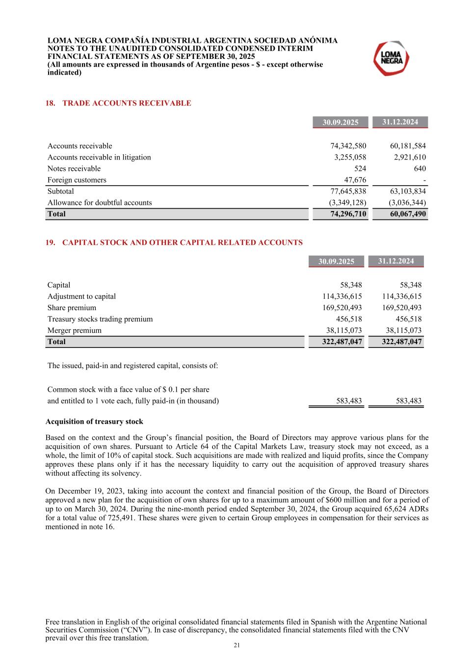 18. TRADE ACCOUNTS RECEIVABLE 30.09.2025 31.12.2024 Accounts receivable 74,342,580 60,181,584 Accounts receivable in litigation 3,255,058 2,921,610 Notes receivable 524 640 Foreign customers 47,676 - Subtotal 77,645,838 63,103,834 Allowance for doubtful accounts (3,349,128) (3,036,344) Total 74,296,710 60,067,490 19. CAPITAL STOCK AND OTHER CAPITAL RELATED ACCOUNTS 30.09.2025 31.12.2024 Capital 58,348 58,348 Adjustment to capital 114,336,615 114,336,615 Share premium 169,520,493 169,520,493 Treasury stocks trading premium 456,518 456,518 Merger premium 38,115,073 38,115,073 Total 322,487,047 322,487,047 The issued, paid-in and registered capital, consists of: Common stock with a face value of $ 0.1 per share and entitled to 1 vote each, fully paid-in (in thousand) 583,483 583,483 Acquisition of treasury stock Based on the context and the Group’s financial position, the Board of Directors may approve various plans for the acquisition of own shares. Pursuant to Article 64 of the Capital Markets Law, treasury stock may not exceed, as a whole, the limit of 10% of capital stock. Such acquisitions are made with realized and liquid profits, since the Company approves these plans only if it has the necessary liquidity to carry out the acquisition of approved treasury shares without affecting its solvency. On December 19, 2023, taking into account the context and financial position of the Group, the Board of Directors approved a new plan for the acquisition of own shares for up to a maximum amount of $600 million and for a period of up to on March 30, 2024. During the nine-month period ended September 30, 2024, the Group acquired 65,624 ADRs for a total value of 725,491. These shares were given to certain Group employees in compensation for their services as mentioned in note 16. LOMA NEGRA COMPAÑÍA INDUSTRIAL ARGENTINA SOCIEDAD ANÓNIMA NOTES TO THE UNAUDITED CONSOLIDATED CONDENSED INTERIM FINANCIAL STATEMENTS AS OF SEPTEMBER 30, 2025 (All amounts are expressed in thousands of Argentine pesos - $ - except otherwise indicated) Free translation in English of the original consolidated financial statements filed in Spanish with the Argentine National Securities Commission (“CNV”). In case of discrepancy, the consolidated financial statements filed with the CNV prevail over this free translation. 21