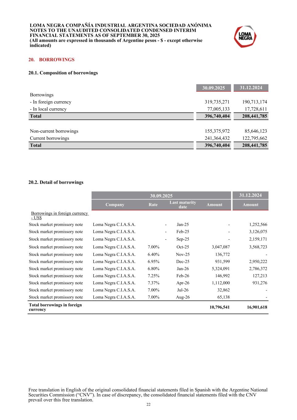 20. BORROWINGS 20.1. Composition of borrowings 30.09.2025 31.12.2024 Borrowings - In foreign currency 319,735,271 190,713,174 - In local currency 77,005,133 17,728,611 Total 396,740,404 208,441,785 Non-current borrowings 155,375,972 85,646,123 Current borrowings 241,364,432 122,795,662 Total 396,740,404 208,441,785 20.2. Detail of borrowings 30.09.2025 31.12.2024 Company Rate Last maturity date Amount Amount Borrowings in foreign currency - US$ Stock market promissory note Loma Negra C.I.A.S.A. - Jan-25 - 1,252,566 Stock market promissory note Loma Negra C.I.A.S.A. - Feb-25 - 3,126,075 Stock market promissory note Loma Negra C.I.A.S.A. - Sep-25 - 2,159,171 Stock market promissory note Loma Negra C.I.A.S.A. 7.00% Oct-25 3,047,087 3,568,723 Stock market promissory note Loma Negra C.I.A.S.A. 6.40% Nov-25 136,772 - Stock market promissory note Loma Negra C.I.A.S.A. 6.95% Dec-25 931,599 2,950,222 Stock market promissory note Loma Negra C.I.A.S.A. 6.80% Jan-26 5,324,091 2,786,372 Stock market promissory note Loma Negra C.I.A.S.A. 7.25% Feb-26 146,992 127,213 Stock market promissory note Loma Negra C.I.A.S.A. 7.37% Apr-26 1,112,000 931,276 Stock market promissory note Loma Negra C.I.A.S.A. 7.00% Jul-26 32,862 - Stock market promissory note Loma Negra C.I.A.S.A. 7.00% Aug-26 65,138 - Total borrowings in foreign currency 10,796,541 16,901,618 LOMA NEGRA COMPAÑÍA INDUSTRIAL ARGENTINA SOCIEDAD ANÓNIMA NOTES TO THE UNAUDITED CONSOLIDATED CONDENSED INTERIM FINANCIAL STATEMENTS AS OF SEPTEMBER 30, 2025 (All amounts are expressed in thousands of Argentine pesos - $ - except otherwise indicated) Free translation in English of the original consolidated financial statements filed in Spanish with the Argentine National Securities Commission (“CNV”). In case of discrepancy, the consolidated financial statements filed with the CNV prevail over this free translation. 22