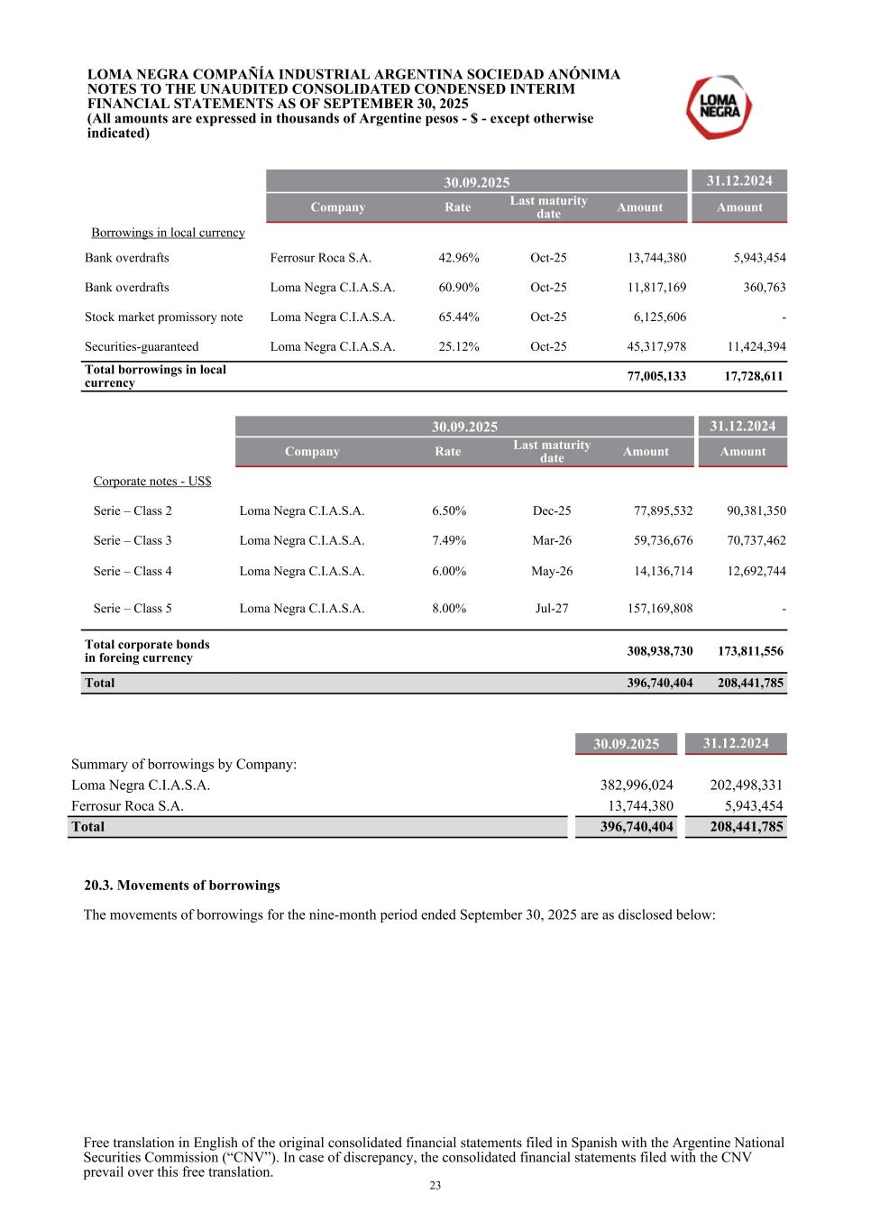 30.09.2025 31.12.2024 Company Rate Last maturity date Amount Amount Borrowings in local currency Bank overdrafts Ferrosur Roca S.A. 42.96% Oct-25 13,744,380 5,943,454 Bank overdrafts Loma Negra C.I.A.S.A. 60.90% Oct-25 11,817,169 360,763 Stock market promissory note Loma Negra C.I.A.S.A. 65.44% Oct-25 6,125,606 - Securities-guaranteed Loma Negra C.I.A.S.A. 25.12% Oct-25 45,317,978 11,424,394 Total borrowings in local currency 77,005,133 17,728,611 30.09.2025 31.12.2024 Company Rate Last maturity date Amount Amount Corporate notes - US$ Serie – Class 2 Loma Negra C.I.A.S.A. 6.50% Dec-25 77,895,532 90,381,350 Serie – Class 3 Loma Negra C.I.A.S.A. 7.49% Mar-26 59,736,676 70,737,462 Serie – Class 4 Loma Negra C.I.A.S.A. 6.00% May-26 14,136,714 12,692,744 Serie – Class 5 Loma Negra C.I.A.S.A. 8.00% Jul-27 157,169,808 - Total corporate bonds in foreing currency 308,938,730 173,811,556 Total 396,740,404 208,441,785 30.09.2025 31.12.2024 Summary of borrowings by Company: Loma Negra C.I.A.S.A. 382,996,024 202,498,331 Ferrosur Roca S.A. 13,744,380 5,943,454 Total 396,740,404 208,441,785 20.3. Movements of borrowings The movements of borrowings for the nine-month period ended September 30, 2025 are as disclosed below: LOMA NEGRA COMPAÑÍA INDUSTRIAL ARGENTINA SOCIEDAD ANÓNIMA NOTES TO THE UNAUDITED CONSOLIDATED CONDENSED INTERIM FINANCIAL STATEMENTS AS OF SEPTEMBER 30, 2025 (All amounts are expressed in thousands of Argentine pesos - $ - except otherwise indicated) Free translation in English of the original consolidated financial statements filed in Spanish with the Argentine National Securities Commission (“CNV”). In case of discrepancy, the consolidated financial statements filed with the CNV prevail over this free translation. 23