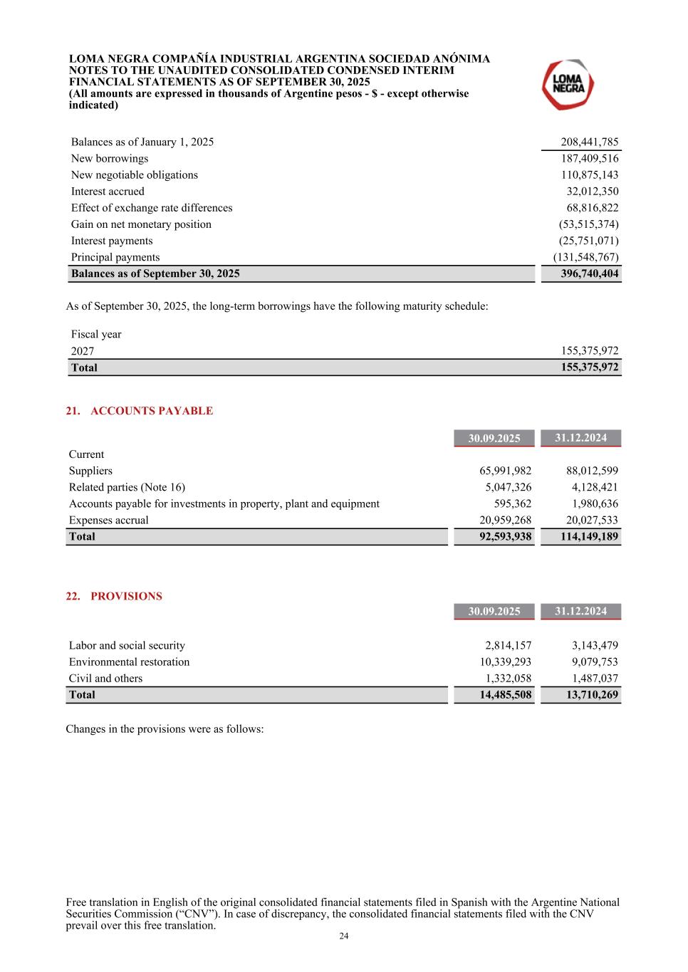 Balances as of January 1, 2025 208,441,785 New borrowings 187,409,516 New negotiable obligations 110,875,143 Interest accrued 32,012,350 Effect of exchange rate differences 68,816,822 Gain on net monetary position (53,515,374) Interest payments (25,751,071) Principal payments (131,548,767) Balances as of September 30, 2025 396,740,404 As of September 30, 2025, the long-term borrowings have the following maturity schedule: Fiscal year 2027 155,375,972 Total 155,375,972 21. ACCOUNTS PAYABLE 30.09.2025 31.12.2024 Current Suppliers 65,991,982 88,012,599 Related parties (Note 16) 5,047,326 4,128,421 Accounts payable for investments in property, plant and equipment 595,362 1,980,636 Expenses accrual 20,959,268 20,027,533 Total 92,593,938 114,149,189 22. PROVISIONS 30.09.2025 31.12.2024 Labor and social security 2,814,157 3,143,479 Environmental restoration 10,339,293 9,079,753 Civil and others 1,332,058 1,487,037 Total 14,485,508 13,710,269 Changes in the provisions were as follows: LOMA NEGRA COMPAÑÍA INDUSTRIAL ARGENTINA SOCIEDAD ANÓNIMA NOTES TO THE UNAUDITED CONSOLIDATED CONDENSED INTERIM FINANCIAL STATEMENTS AS OF SEPTEMBER 30, 2025 (All amounts are expressed in thousands of Argentine pesos - $ - except otherwise indicated) Free translation in English of the original consolidated financial statements filed in Spanish with the Argentine National Securities Commission (“CNV”). In case of discrepancy, the consolidated financial statements filed with the CNV prevail over this free translation. 24