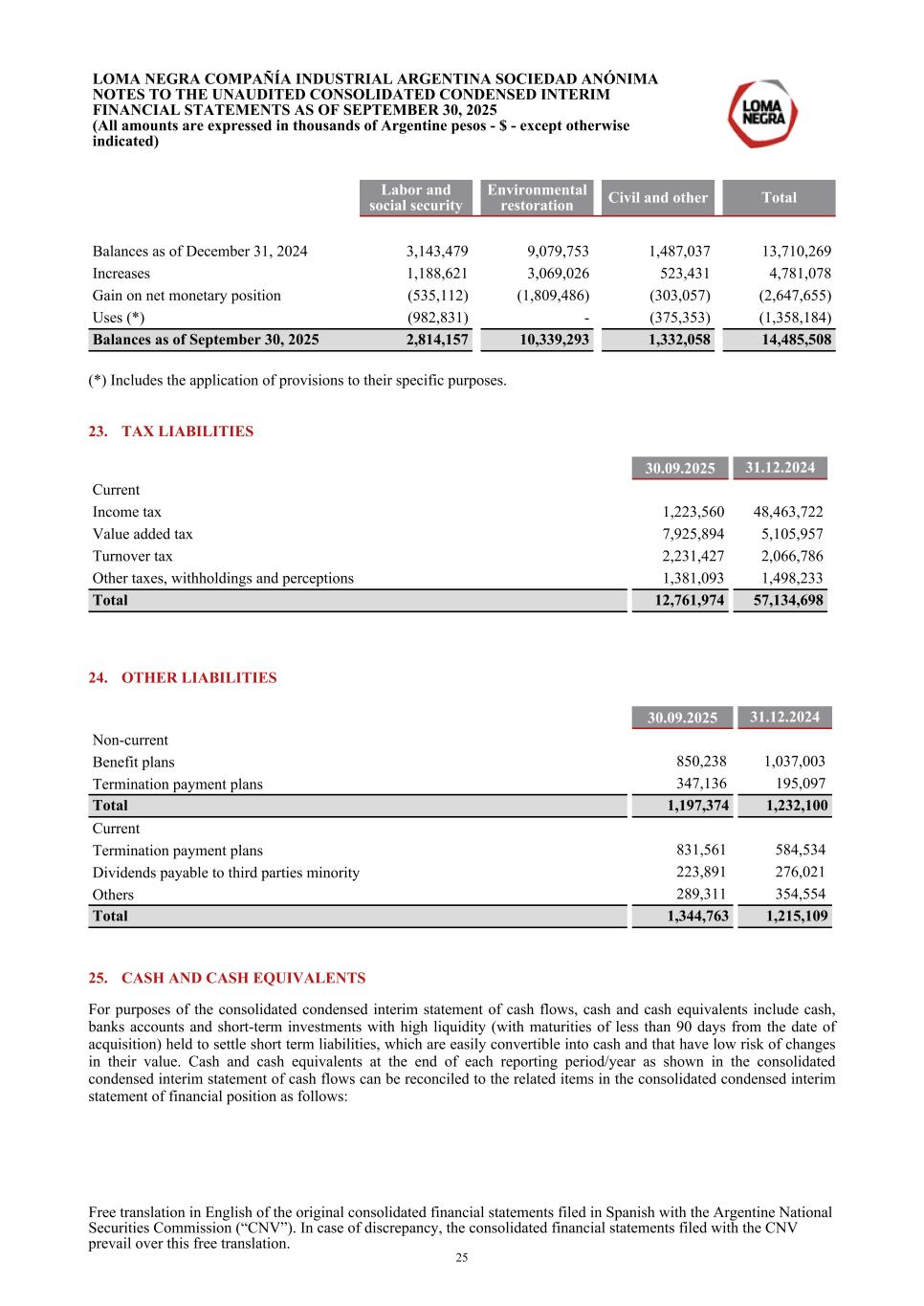 Labor and social security Environmental restoration Civil and other Total Balances as of December 31, 2024 3,143,479 9,079,753 1,487,037 13,710,269 Increases 1,188,621 3,069,026 523,431 4,781,078 Gain on net monetary position (535,112) (1,809,486) (303,057) (2,647,655) Uses (*) (982,831) - (375,353) (1,358,184) Balances as of September 30, 2025 2,814,157 10,339,293 1,332,058 14,485,508 (*) Includes the application of provisions to their specific purposes. 23. TAX LIABILITIES 30.09.2025 31.12.2024 Current Income tax 1,223,560 48,463,722 Value added tax 7,925,894 5,105,957 Turnover tax 2,231,427 2,066,786 Other taxes, withholdings and perceptions 1,381,093 1,498,233 Total 12,761,974 57,134,698 24. OTHER LIABILITIES 30.09.2025 31.12.2024 Non-current Benefit plans 850,238 1,037,003 Termination payment plans 347,136 195,097 Total 1,197,374 1,232,100 Current Termination payment plans 831,561 584,534 Dividends payable to third parties minority 223,891 276,021 Others 289,311 354,554 Total 1,344,763 1,215,109 25. CASH AND CASH EQUIVALENTS For purposes of the consolidated condensed interim statement of cash flows, cash and cash equivalents include cash, banks accounts and short-term investments with high liquidity (with maturities of less than 90 days from the date of acquisition) held to settle short term liabilities, which are easily convertible into cash and that have low risk of changes in their value. Cash and cash equivalents at the end of each reporting period/year as shown in the consolidated condensed interim statement of cash flows can be reconciled to the related items in the consolidated condensed interim statement of financial position as follows: LOMA NEGRA COMPAÑÍA INDUSTRIAL ARGENTINA SOCIEDAD ANÓNIMA NOTES TO THE UNAUDITED CONSOLIDATED CONDENSED INTERIM FINANCIAL STATEMENTS AS OF SEPTEMBER 30, 2025 (All amounts are expressed in thousands of Argentine pesos - $ - except otherwise indicated) Free translation in English of the original consolidated financial statements filed in Spanish with the Argentine National Securities Commission (“CNV”). In case of discrepancy, the consolidated financial statements filed with the CNV prevail over this free translation. 25
