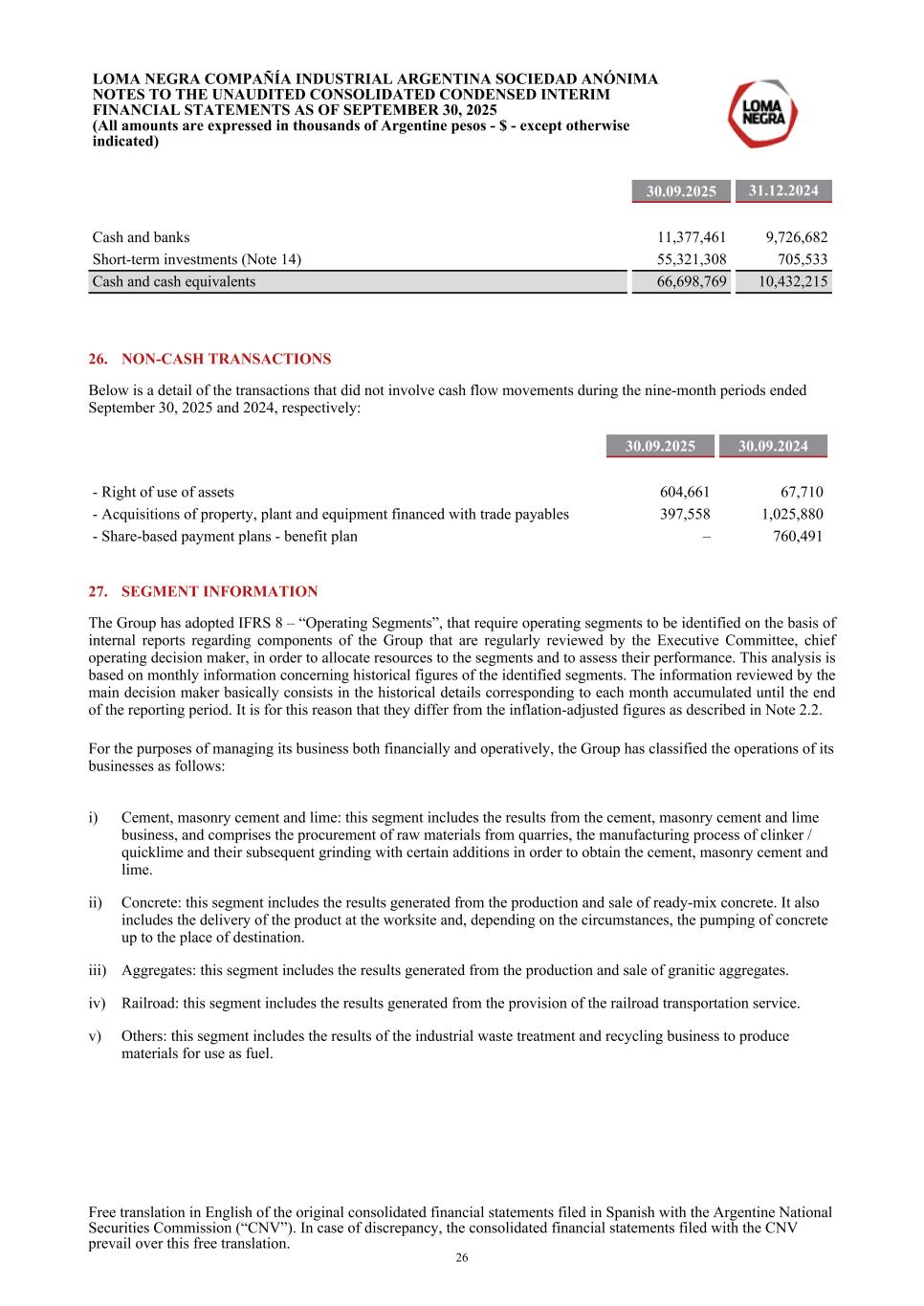 30.09.2025 31.12.2024 Cash and banks 11,377,461 9,726,682 Short-term investments (Note 14) 55,321,308 705,533 Cash and cash equivalents 66,698,769 10,432,215 26. NON-CASH TRANSACTIONS Below is a detail of the transactions that did not involve cash flow movements during the nine-month periods ended September 30, 2025 and 2024, respectively: 30.09.2025 30.09.2024 - Right of use of assets 604,661 67,710 - Acquisitions of property, plant and equipment financed with trade payables 397,558 1,025,880 - Share-based payment plans - benefit plan – 760,491 27. SEGMENT INFORMATION The Group has adopted IFRS 8 – “Operating Segments”, that require operating segments to be identified on the basis of internal reports regarding components of the Group that are regularly reviewed by the Executive Committee, chief operating decision maker, in order to allocate resources to the segments and to assess their performance. This analysis is based on monthly information concerning historical figures of the identified segments. The information reviewed by the main decision maker basically consists in the historical details corresponding to each month accumulated until the end of the reporting period. It is for this reason that they differ from the inflation-adjusted figures as described in Note 2.2. For the purposes of managing its business both financially and operatively, the Group has classified the operations of its businesses as follows: i) Cement, masonry cement and lime: this segment includes the results from the cement, masonry cement and lime business, and comprises the procurement of raw materials from quarries, the manufacturing process of clinker / quicklime and their subsequent grinding with certain additions in order to obtain the cement, masonry cement and lime. ii) Concrete: this segment includes the results generated from the production and sale of ready-mix concrete. It also includes the delivery of the product at the worksite and, depending on the circumstances, the pumping of concrete up to the place of destination. iii) Aggregates: this segment includes the results generated from the production and sale of granitic aggregates. iv) Railroad: this segment includes the results generated from the provision of the railroad transportation service. v) Others: this segment includes the results of the industrial waste treatment and recycling business to produce materials for use as fuel. LOMA NEGRA COMPAÑÍA INDUSTRIAL ARGENTINA SOCIEDAD ANÓNIMA NOTES TO THE UNAUDITED CONSOLIDATED CONDENSED INTERIM FINANCIAL STATEMENTS AS OF SEPTEMBER 30, 2025 (All amounts are expressed in thousands of Argentine pesos - $ - except otherwise indicated) Free translation in English of the original consolidated financial statements filed in Spanish with the Argentine National Securities Commission (“CNV”). In case of discrepancy, the consolidated financial statements filed with the CNV prevail over this free translation. 26