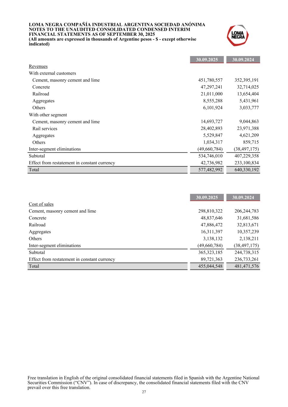 30.09.2025 30.09.2024 Revenues With external customers Cement, masonry cement and lime 451,780,557 352,395,191 Concrete 47,297,241 32,714,025 Railroad 21,011,000 13,654,404 Aggregates 8,555,288 5,431,961 Others 6,101,924 3,033,777 With other segment Cement, masonry cement and lime 14,693,727 9,044,863 Rail services 28,402,893 23,971,388 Aggregates 5,529,847 4,621,209 Others 1,034,317 859,715 Inter-segment eliminations (49,660,784) (38,497,175) Subtotal 534,746,010 407,229,358 Effect from restatement in constant currency 42,736,982 233,100,834 Total 577,482,992 640,330,192 30.09.2025 30.09.2024 Cost of sales Cement, masonry cement and lime 298,810,322 206,244,783 Concrete 48,837,646 31,681,586 Railroad 47,886,472 32,813,671 Aggregates 16,311,397 10,357,239 Others 3,138,132 2,138,211 Inter-segment eliminations (49,660,784) (38,497,175) Subtotal 365,323,185 244,738,315 Effect from restatement in constant currency 89,721,363 236,733,261 Total 455,044,548 481,471,576 LOMA NEGRA COMPAÑÍA INDUSTRIAL ARGENTINA SOCIEDAD ANÓNIMA NOTES TO THE UNAUDITED CONSOLIDATED CONDENSED INTERIM FINANCIAL STATEMENTS AS OF SEPTEMBER 30, 2025 (All amounts are expressed in thousands of Argentine pesos - $ - except otherwise indicated) Free translation in English of the original consolidated financial statements filed in Spanish with the Argentine National Securities Commission (“CNV”). In case of discrepancy, the consolidated financial statements filed with the CNV prevail over this free translation. 27