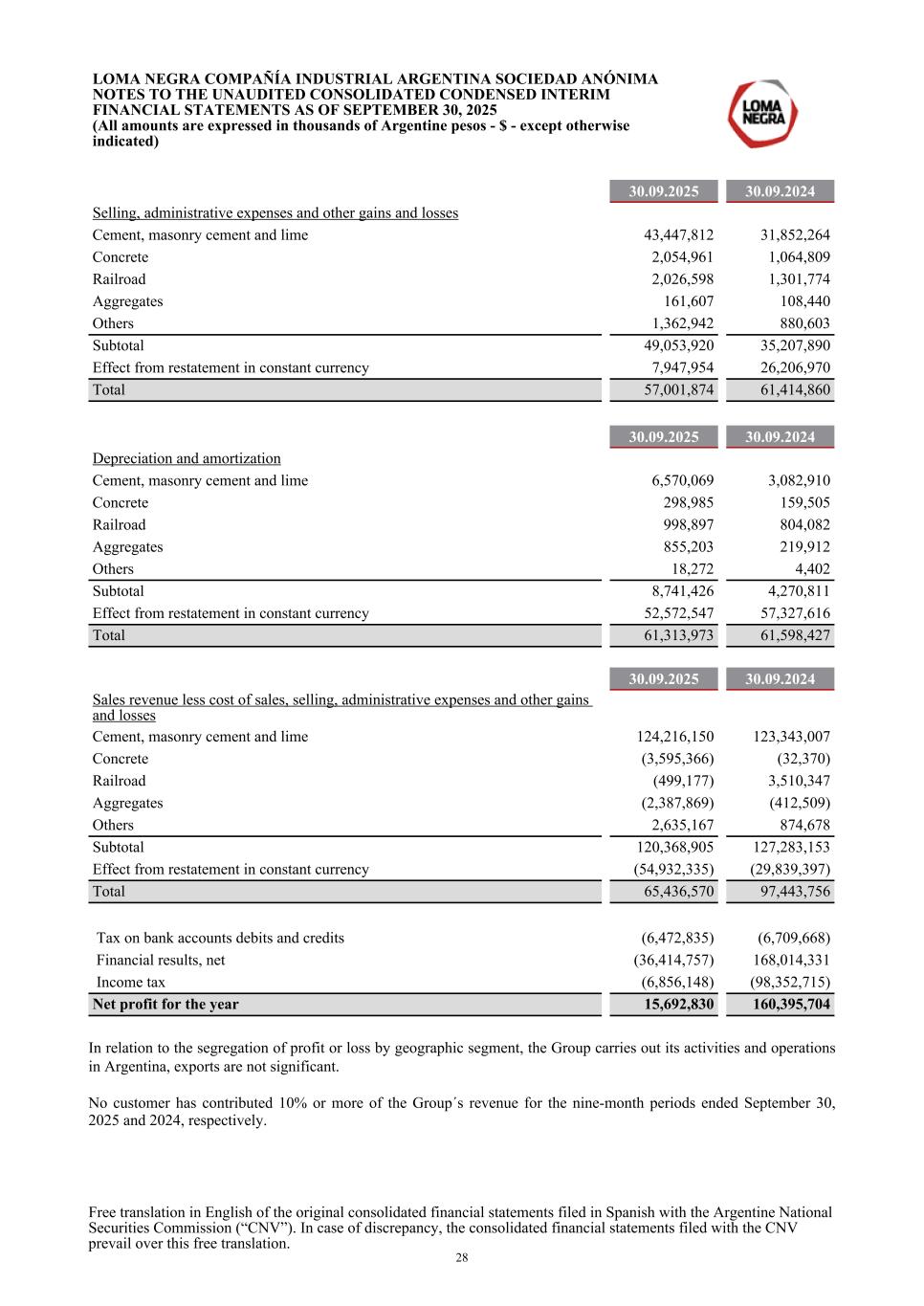 30.09.2025 30.09.2024 Selling, administrative expenses and other gains and losses Cement, masonry cement and lime 43,447,812 31,852,264 Concrete 2,054,961 1,064,809 Railroad 2,026,598 1,301,774 Aggregates 161,607 108,440 Others 1,362,942 880,603 Subtotal 49,053,920 35,207,890 Effect from restatement in constant currency 7,947,954 26,206,970 Total 57,001,874 61,414,860 30.09.2025 30.09.2024 Depreciation and amortization Cement, masonry cement and lime 6,570,069 3,082,910 Concrete 298,985 159,505 Railroad 998,897 804,082 Aggregates 855,203 219,912 Others 18,272 4,402 Subtotal 8,741,426 4,270,811 Effect from restatement in constant currency 52,572,547 57,327,616 Total 61,313,973 61,598,427 30.09.2025 30.09.2024 Sales revenue less cost of sales, selling, administrative expenses and other gains and losses Cement, masonry cement and lime 124,216,150 123,343,007 Concrete (3,595,366) (32,370) Railroad (499,177) 3,510,347 Aggregates (2,387,869) (412,509) Others 2,635,167 874,678 Subtotal 120,368,905 127,283,153 Effect from restatement in constant currency (54,932,335) (29,839,397) Total 65,436,570 97,443,756 Tax on bank accounts debits and credits (6,472,835) (6,709,668) Financial results, net (36,414,757) 168,014,331 Income tax (6,856,148) (98,352,715) Net profit for the year 15,692,830 160,395,704 In relation to the segregation of profit or loss by geographic segment, the Group carries out its activities and operations in Argentina, exports are not significant. No customer has contributed 10% or more of the Group´s revenue for the nine-month periods ended September 30, 2025 and 2024, respectively. LOMA NEGRA COMPAÑÍA INDUSTRIAL ARGENTINA SOCIEDAD ANÓNIMA NOTES TO THE UNAUDITED CONSOLIDATED CONDENSED INTERIM FINANCIAL STATEMENTS AS OF SEPTEMBER 30, 2025 (All amounts are expressed in thousands of Argentine pesos - $ - except otherwise indicated) Free translation in English of the original consolidated financial statements filed in Spanish with the Argentine National Securities Commission (“CNV”). In case of discrepancy, the consolidated financial statements filed with the CNV prevail over this free translation. 28