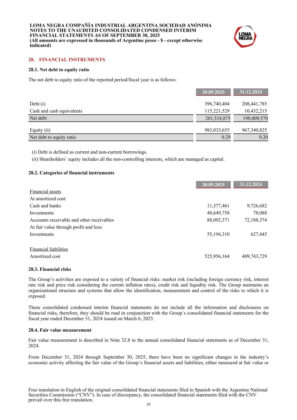 28. FINANCIAL INSTRUMENTS 28.1. Net debt to equity ratio The net debt to equity ratio of the reported period/fiscal year is as follows: 30.09.2025 31.12.2024 Debt (i) 396,740,404 208,441,785 Cash and cash equivalents 115,221,529 10,432,215 Net debt 281,518,875 198,009,570 Equity (ii) 983,033,655 967,340,825 Net debt to equity ratio 0.29 0.20 (i) Debt is defined as current and non-current borrowings. (ii) Shareholders’ equity includes all the non-controlling interests, which are managed as capital. 28.2. Categories of financial instruments 30.09.2025 31.12.2024 Financial assets At amortized cost: Cash and banks 11,377,461 9,726,682 Investments 48,649,758 78,088 Accounts receivable and other receivables 88,092,371 72,188,374 At fair value through profit and loss: Investments 55,194,310 627,445 Financial liabilities Amortized cost 525,956,164 409,743,729 28.3. Financial risks The Group´s activities are exposed to a variety of financial risks: market risk (including foreign currency risk, interest rate risk and price risk considering the current inflation rates), credit risk and liquidity risk. The Group maintains an organizational structure and systems that allow the identification, measurement and control of the risks to which it is exposed. These consolidated condensed interim financial statements do not include all the information and disclosures on financial risks, therefore, they should be read in conjunction with the Group´s consolidated financial statements for the fiscal year ended December 31, 2024 issued on March 6, 2025. 28.4. Fair value measurement Fair value measurement is described in Note 32.8 to the annual consolidated financial statements as of December 31, 2024. From December 31, 2024 through September 30, 2025, there have been no significant changes in the industry’s economic activity affecting the fair value of the Group´s financial assets and liabilities, either measured at fair value or LOMA NEGRA COMPAÑÍA INDUSTRIAL ARGENTINA SOCIEDAD ANÓNIMA NOTES TO THE UNAUDITED CONSOLIDATED CONDENSED INTERIM FINANCIAL STATEMENTS AS OF SEPTEMBER 30, 2025 (All amounts are expressed in thousands of Argentine pesos - $ - except otherwise indicated) Free translation in English of the original consolidated financial statements filed in Spanish with the Argentine National Securities Commission (“CNV”). In case of discrepancy, the consolidated financial statements filed with the CNV prevail over this free translation. 29