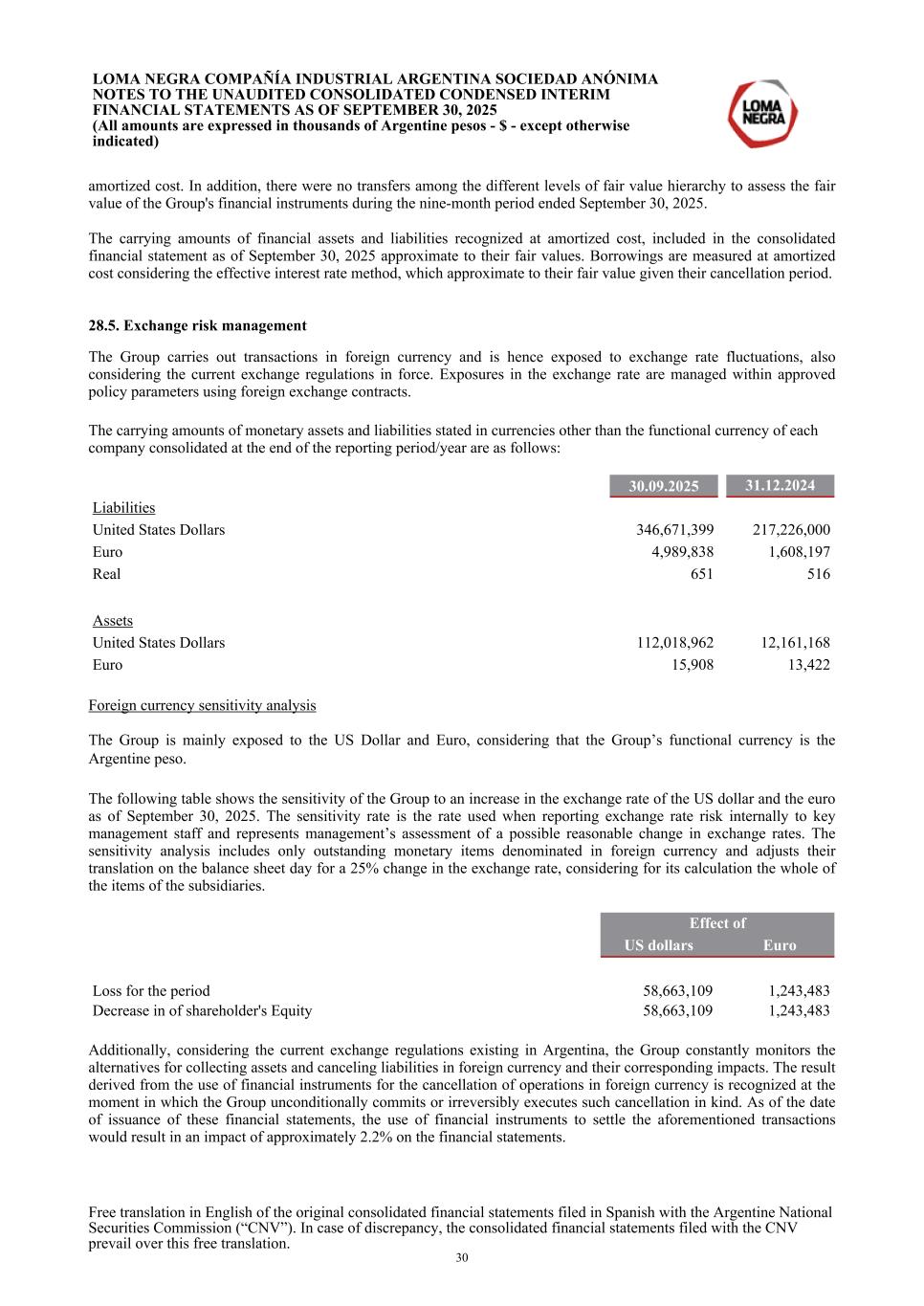 amortized cost. In addition, there were no transfers among the different levels of fair value hierarchy to assess the fair value of the Group's financial instruments during the nine-month period ended September 30, 2025. The carrying amounts of financial assets and liabilities recognized at amortized cost, included in the consolidated financial statement as of September 30, 2025 approximate to their fair values. Borrowings are measured at amortized cost considering the effective interest rate method, which approximate to their fair value given their cancellation period. 28.5. Exchange risk management The Group carries out transactions in foreign currency and is hence exposed to exchange rate fluctuations, also considering the current exchange regulations in force. Exposures in the exchange rate are managed within approved policy parameters using foreign exchange contracts. The carrying amounts of monetary assets and liabilities stated in currencies other than the functional currency of each company consolidated at the end of the reporting period/year are as follows: 30.09.2025 31.12.2024 Liabilities United States Dollars 346,671,399 217,226,000 Euro 4,989,838 1,608,197 Real 651 516 Assets United States Dollars 112,018,962 12,161,168 Euro 15,908 13,422 Foreign currency sensitivity analysis The Group is mainly exposed to the US Dollar and Euro, considering that the Group’s functional currency is the Argentine peso. The following table shows the sensitivity of the Group to an increase in the exchange rate of the US dollar and the euro as of September 30, 2025. The sensitivity rate is the rate used when reporting exchange rate risk internally to key management staff and represents management’s assessment of a possible reasonable change in exchange rates. The sensitivity analysis includes only outstanding monetary items denominated in foreign currency and adjusts their translation on the balance sheet day for a 25% change in the exchange rate, considering for its calculation the whole of the items of the subsidiaries. Effect of US dollars Euro Loss for the period 58,663,109 1,243,483 Decrease in of shareholder's Equity 58,663,109 1,243,483 Additionally, considering the current exchange regulations existing in Argentina, the Group constantly monitors the alternatives for collecting assets and canceling liabilities in foreign currency and their corresponding impacts. The result derived from the use of financial instruments for the cancellation of operations in foreign currency is recognized at the moment in which the Group unconditionally commits or irreversibly executes such cancellation in kind. As of the date of issuance of these financial statements, the use of financial instruments to settle the aforementioned transactions would result in an impact of approximately 2.2% on the financial statements. LOMA NEGRA COMPAÑÍA INDUSTRIAL ARGENTINA SOCIEDAD ANÓNIMA NOTES TO THE UNAUDITED CONSOLIDATED CONDENSED INTERIM FINANCIAL STATEMENTS AS OF SEPTEMBER 30, 2025 (All amounts are expressed in thousands of Argentine pesos - $ - except otherwise indicated) Free translation in English of the original consolidated financial statements filed in Spanish with the Argentine National Securities Commission (“CNV”). In case of discrepancy, the consolidated financial statements filed with the CNV prevail over this free translation. 30
