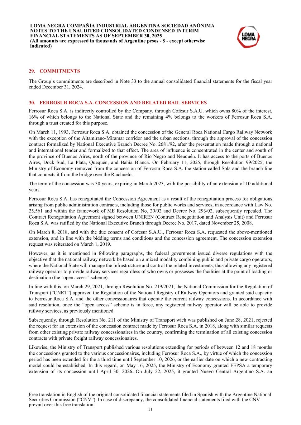 29. COMMITMENTS The Group’s commitments are described in Note 33 to the annual consolidated financial statements for the fiscal year ended December 31, 2024. 30. FERROSUR ROCA S.A. CONCESSION AND RELATED RAIL SERVICES Ferrosur Roca S.A. is indirectly controlled by the Company, through Cofesur S.A.U. which owns 80% of the interest, 16% of which belongs to the National State and the remaining 4% belongs to the workers of Ferrosur Roca S.A. through a trust created for this purpose. On March 11, 1993, Ferrosur Roca S.A. obtained the concession of the General Roca National Cargo Railway Network with the exception of the Altamirano-Miramar corridor and the urban sections, through the approval of the concession contract formalized by National Executive Branch Decree No. 2681/92, after the presentation made through a national and international tender and formalized to that effect. The area of influence is concentrated in the center and south of the province of Buenos Aires, north of the province of Río Negro and Neuquén. It has access to the ports of Buenos Aires, Dock Sud, La Plata, Quequén, and Bahía Blanca. On February 11, 2025, through Resolution 99/2025, the Ministry of Economy removed from the concession of Ferrosur Roca S.A. the station called Sola and the branch line that connects it from the bridge over the Riachuelo. The term of the concession was 30 years, expiring in March 2023, with the possibility of an extension of 10 additional years. Ferrosur Roca S.A. has renegotiated the Concession Agreement as a result of the renegotiation process for obligations arising from public administration contracts, including those for public works and services, in accordance with Law No. 25,561 and within the framework of ME Resolution No. 20/02 and Decree No. 293/02, subsequently repealed. The Contract Renegotiation Agreement signed between UNIREN (Contract Renegotiation and Analysis Unit) and Ferrosur Roca S.A. was ratified by the National Executive Branch through Decree No. 2017, dated November 25, 2008. On March 8, 2018, and with the due consent of Cofesur S.A.U., Ferrosur Roca S.A. requested the above-mentioned extension, and in line with the bidding terms and conditions and the concession agreement. The concession extension request was reiterated on March 1, 2019. However, as it is mentioned in following paragraphs, the federal government issued diverse regulations with the objective that the national railway network be based on a mixed modality combining public and private cargo operators, where the National State will manage the infrastructure and control the related investments, thus allowing any registered railway operator to provide railway services regardless of who owns or possesses the facilities at the point of loading or destination (the "open access" scheme). In line with this, on March 29, 2021, through Resolution No. 219/2021, the National Commission for the Regulation of Transport (“CNRT”) approved the Regulation of the National Registry of Railway Operators and granted said capacity to Ferrosur Roca S.A. and the other concessionaires that operate the current railway concessions. In accordance with said resolution, once the “open access” scheme is in force, any registered railway operator will be able to provide railway services, as previously mentioned. Subsequently, through Resolution No. 211 of the Ministry of Transport wich was published on June 28, 2021, rejected the request for an extension of the concession contract made by Ferrosur Roca S.A. in 2018, along with similar requests from other existing private railway concessionaires in the country, confirming the termination of all existing concession contracts with private freight railway concessionaires. Likewise, the Ministry of Transport published various resolutions extending for periods of between 12 and 18 months the concessions granted to the various concessionaires, including Ferrosur Roca S.A., by virtue of which the concession period has been extended for the a third time until September 10, 2026, or the earlier date on which a new contracting model could be established. In this regard, on May 16, 2025, the Ministry of Economy granted FEPSA a temporary extension of its concession until April 30, 2026. On July 22, 2025, it granted Nuevo Central Argentino S.A. an LOMA NEGRA COMPAÑÍA INDUSTRIAL ARGENTINA SOCIEDAD ANÓNIMA NOTES TO THE UNAUDITED CONSOLIDATED CONDENSED INTERIM FINANCIAL STATEMENTS AS OF SEPTEMBER 30, 2025 (All amounts are expressed in thousands of Argentine pesos - $ - except otherwise indicated) Free translation in English of the original consolidated financial statements filed in Spanish with the Argentine National Securities Commission (“CNV”). In case of discrepancy, the consolidated financial statements filed with the CNV prevail over this free translation. 31