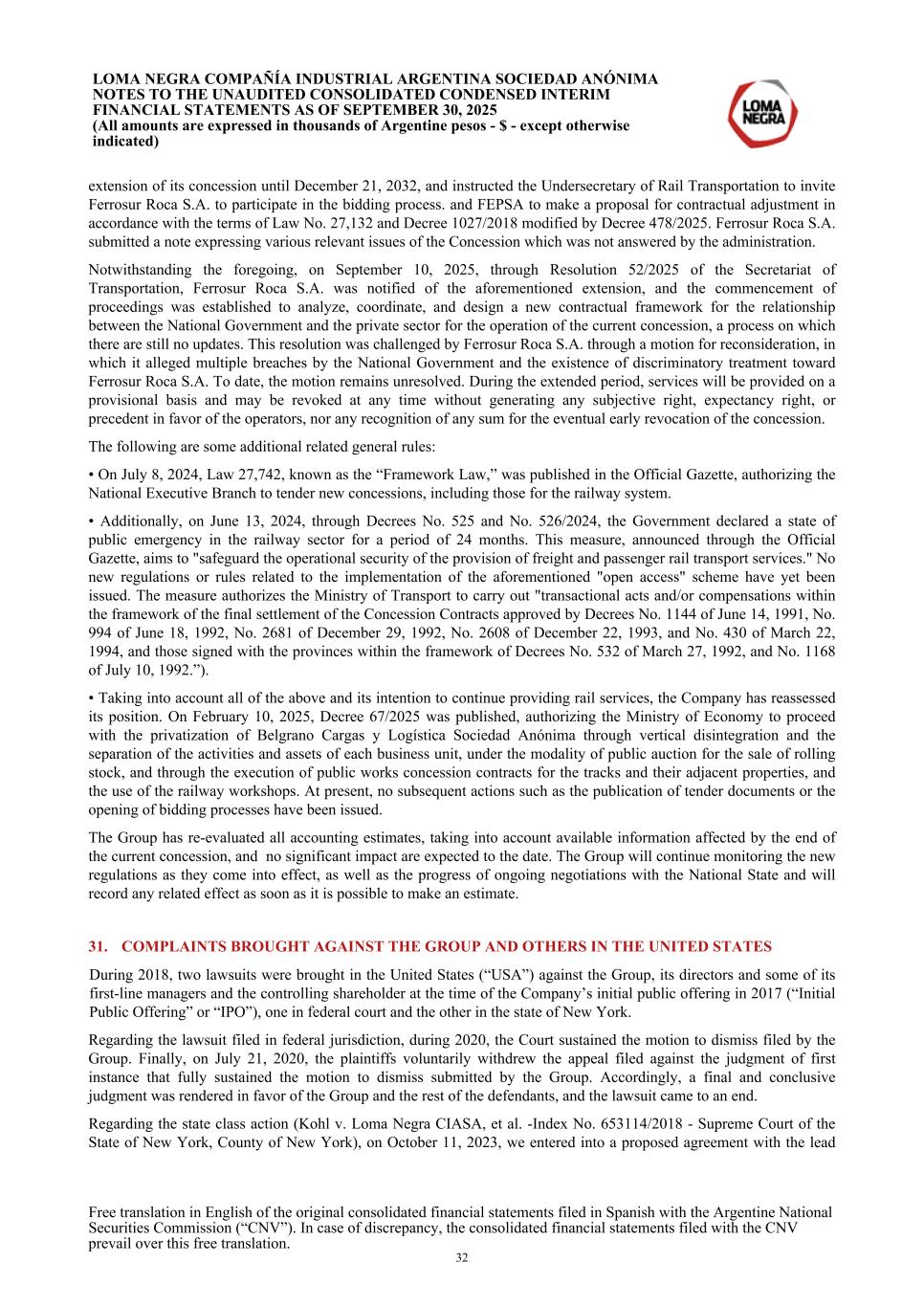 extension of its concession until December 21, 2032, and instructed the Undersecretary of Rail Transportation to invite Ferrosur Roca S.A. to participate in the bidding process. and FEPSA to make a proposal for contractual adjustment in accordance with the terms of Law No. 27,132 and Decree 1027/2018 modified by Decree 478/2025. Ferrosur Roca S.A. submitted a note expressing various relevant issues of the Concession which was not answered by the administration. Notwithstanding the foregoing, on September 10, 2025, through Resolution 52/2025 of the Secretariat of Transportation, Ferrosur Roca S.A. was notified of the aforementioned extension, and the commencement of proceedings was established to analyze, coordinate, and design a new contractual framework for the relationship between the National Government and the private sector for the operation of the current concession, a process on which there are still no updates. This resolution was challenged by Ferrosur Roca S.A. through a motion for reconsideration, in which it alleged multiple breaches by the National Government and the existence of discriminatory treatment toward Ferrosur Roca S.A. To date, the motion remains unresolved. During the extended period, services will be provided on a provisional basis and may be revoked at any time without generating any subjective right, expectancy right, or precedent in favor of the operators, nor any recognition of any sum for the eventual early revocation of the concession. The following are some additional related general rules: • On July 8, 2024, Law 27,742, known as the “Framework Law,” was published in the Official Gazette, authorizing the National Executive Branch to tender new concessions, including those for the railway system. • Additionally, on June 13, 2024, through Decrees No. 525 and No. 526/2024, the Government declared a state of public emergency in the railway sector for a period of 24 months. This measure, announced through the Official Gazette, aims to "safeguard the operational security of the provision of freight and passenger rail transport services." No new regulations or rules related to the implementation of the aforementioned "open access" scheme have yet been issued. The measure authorizes the Ministry of Transport to carry out "transactional acts and/or compensations within the framework of the final settlement of the Concession Contracts approved by Decrees No. 1144 of June 14, 1991, No. 994 of June 18, 1992, No. 2681 of December 29, 1992, No. 2608 of December 22, 1993, and No. 430 of March 22, 1994, and those signed with the provinces within the framework of Decrees No. 532 of March 27, 1992, and No. 1168 of July 10, 1992.”). • Taking into account all of the above and its intention to continue providing rail services, the Company has reassessed its position. On February 10, 2025, Decree 67/2025 was published, authorizing the Ministry of Economy to proceed with the privatization of Belgrano Cargas y Logística Sociedad Anónima through vertical disintegration and the separation of the activities and assets of each business unit, under the modality of public auction for the sale of rolling stock, and through the execution of public works concession contracts for the tracks and their adjacent properties, and the use of the railway workshops. At present, no subsequent actions such as the publication of tender documents or the opening of bidding processes have been issued. The Group has re-evaluated all accounting estimates, taking into account available information affected by the end of the current concession, and no significant impact are expected to the date. The Group will continue monitoring the new regulations as they come into effect, as well as the progress of ongoing negotiations with the National State and will record any related effect as soon as it is possible to make an estimate. 31. COMPLAINTS BROUGHT AGAINST THE GROUP AND OTHERS IN THE UNITED STATES During 2018, two lawsuits were brought in the United States (“USA”) against the Group, its directors and some of its first-line managers and the controlling shareholder at the time of the Company’s initial public offering in 2017 (“Initial Public Offering” or “IPO”), one in federal court and the other in the state of New York. Regarding the lawsuit filed in federal jurisdiction, during 2020, the Court sustained the motion to dismiss filed by the Group. Finally, on July 21, 2020, the plaintiffs voluntarily withdrew the appeal filed against the judgment of first instance that fully sustained the motion to dismiss submitted by the Group. Accordingly, a final and conclusive judgment was rendered in favor of the Group and the rest of the defendants, and the lawsuit came to an end. Regarding the state class action (Kohl v. Loma Negra CIASA, et al. -Index No. 653114/2018 - Supreme Court of the State of New York, County of New York), on October 11, 2023, we entered into a proposed agreement with the lead LOMA NEGRA COMPAÑÍA INDUSTRIAL ARGENTINA SOCIEDAD ANÓNIMA NOTES TO THE UNAUDITED CONSOLIDATED CONDENSED INTERIM FINANCIAL STATEMENTS AS OF SEPTEMBER 30, 2025 (All amounts are expressed in thousands of Argentine pesos - $ - except otherwise indicated) Free translation in English of the original consolidated financial statements filed in Spanish with the Argentine National Securities Commission (“CNV”). In case of discrepancy, the consolidated financial statements filed with the CNV prevail over this free translation. 32