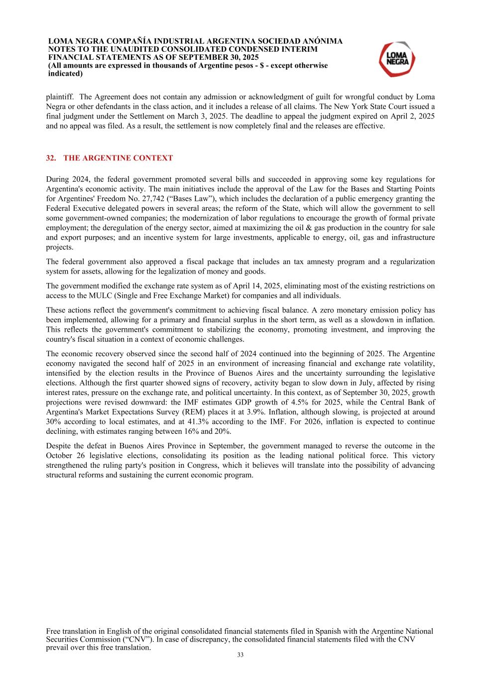 plaintiff. The Agreement does not contain any admission or acknowledgment of guilt for wrongful conduct by Loma Negra or other defendants in the class action, and it includes a release of all claims. The New York State Court issued a final judgment under the Settlement on March 3, 2025. The deadline to appeal the judgment expired on April 2, 2025 and no appeal was filed. As a result, the settlement is now completely final and the releases are effective. 32. THE ARGENTINE CONTEXT During 2024, the federal government promoted several bills and succeeded in approving some key regulations for Argentina's economic activity. The main initiatives include the approval of the Law for the Bases and Starting Points for Argentines' Freedom No. 27,742 (“Bases Law”), which includes the declaration of a public emergency granting the Federal Executive delegated powers in several areas; the reform of the State, which will allow the government to sell some government-owned companies; the modernization of labor regulations to encourage the growth of formal private employment; the deregulation of the energy sector, aimed at maximizing the oil & gas production in the country for sale and export purposes; and an incentive system for large investments, applicable to energy, oil, gas and infrastructure projects. The federal government also approved a fiscal package that includes an tax amnesty program and a regularization system for assets, allowing for the legalization of money and goods. The government modified the exchange rate system as of April 14, 2025, eliminating most of the existing restrictions on access to the MULC (Single and Free Exchange Market) for companies and all individuals. These actions reflect the government's commitment to achieving fiscal balance. A zero monetary emission policy has been implemented, allowing for a primary and financial surplus in the short term, as well as a slowdown in inflation. This reflects the government's commitment to stabilizing the economy, promoting investment, and improving the country's fiscal situation in a context of economic challenges. The economic recovery observed since the second half of 2024 continued into the beginning of 2025. The Argentine economy navigated the second half of 2025 in an environment of increasing financial and exchange rate volatility, intensified by the election results in the Province of Buenos Aires and the uncertainty surrounding the legislative elections. Although the first quarter showed signs of recovery, activity began to slow down in July, affected by rising interest rates, pressure on the exchange rate, and political uncertainty. In this context, as of September 30, 2025, growth projections were revised downward: the IMF estimates GDP growth of 4.5% for 2025, while the Central Bank of Argentina's Market Expectations Survey (REM) places it at 3.9%. Inflation, although slowing, is projected at around 30% according to local estimates, and at 41.3% according to the IMF. For 2026, inflation is expected to continue declining, with estimates ranging between 16% and 20%. Despite the defeat in Buenos Aires Province in September, the government managed to reverse the outcome in the October 26 legislative elections, consolidating its position as the leading national political force. This victory strengthened the ruling party's position in Congress, which it believes will translate into the possibility of advancing structural reforms and sustaining the current economic program. LOMA NEGRA COMPAÑÍA INDUSTRIAL ARGENTINA SOCIEDAD ANÓNIMA NOTES TO THE UNAUDITED CONSOLIDATED CONDENSED INTERIM FINANCIAL STATEMENTS AS OF SEPTEMBER 30, 2025 (All amounts are expressed in thousands of Argentine pesos - $ - except otherwise indicated) Free translation in English of the original consolidated financial statements filed in Spanish with the Argentine National Securities Commission (“CNV”). In case of discrepancy, the consolidated financial statements filed with the CNV prevail over this free translation. 33