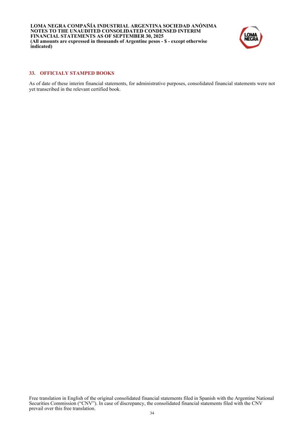 33. OFFICIALY STAMPED BOOKS As of date of these interim financial statements, for administrative purposes, consolidated financial statements were not yet transcribed in the relevant certified book. LOMA NEGRA COMPAÑÍA INDUSTRIAL ARGENTINA SOCIEDAD ANÓNIMA NOTES TO THE UNAUDITED CONSOLIDATED CONDENSED INTERIM FINANCIAL STATEMENTS AS OF SEPTEMBER 30, 2025 (All amounts are expressed in thousands of Argentine pesos - $ - except otherwise indicated) Free translation in English of the original consolidated financial statements filed in Spanish with the Argentine National Securities Commission (“CNV”). In case of discrepancy, the consolidated financial statements filed with the CNV prevail over this free translation. 34