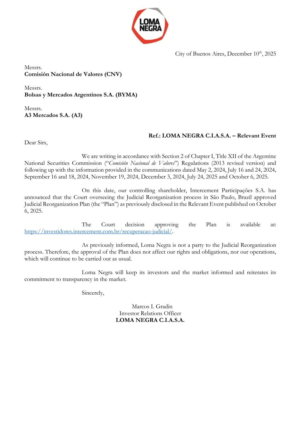 City of Buenos Aires, December 10th, 2025 Messrs. Comisión Nacional de Valores (CNV) Messrs. Bolsas y Mercados Argentinos S.A. (BYMA) Messrs. A3 Mercados S.A. (A3) Ref.: LOMA NEGRA C.I.A.S.A. – Relevant Event Dear Sirs, We are writing in accordance with Section 2 of Chapter I, Title XII of the Argentine National Securities Commission (“Comisión Nacional de Valores”) Regulations (2013 revised version) and following up with the information provided in the communications dated May 2, 2024, July 16 and 24, 2024, September 16 and 18, 2024, November 19, 2024, December 3, 2024, July 24, 2025 and October 6, 2025. On this date, our controlling shareholder, Intercement Participações S.A. has announced that the Court overseeing the Judicial Reorganization process in São Paulo, Brazil approved Judicial Reorganization Plan (the “Plan”) as previously disclosed in the Relevant Event published on October 6, 2025. The Court decision approving the Plan is available at: https://investidores.intercement.com.br/recuperacao-judicial/. As previously informed, Loma Negra is not a party to the Judicial Reorganization process. Therefore, the approval of the Plan does not affect our rights and obligations, nor our operations, which will continue to be carried out as usual. Loma Negra will keep its investors and the market informed and reiterates its commitment to transparency in the market. Sincerely, Marcos I. Gradin Investor Relations Officer LOMA NEGRA C.I.A.S.A.
