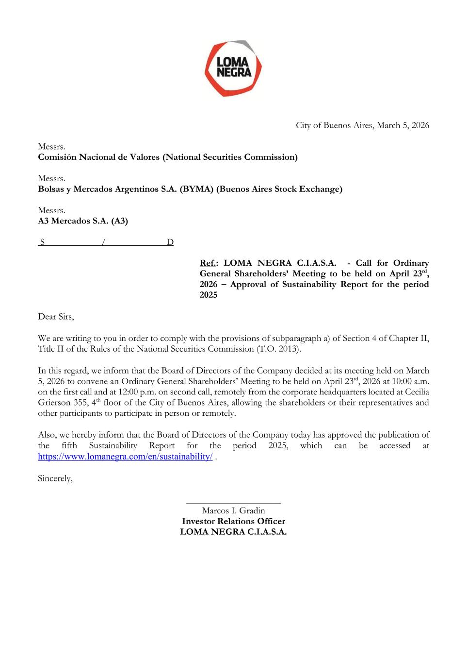 City of Buenos Aires, March 5, 2026 Messrs. Comisión Nacional de Valores (National Securities Commission) Messrs. Bolsas y Mercados Argentinos S.A. (BYMA) (Buenos Aires Stock Exchange) Messrs. A3 Mercados S.A. (A3) S / D Ref.: LOMA NEGRA C.I.A.S.A. - Call for Ordinary General Shareholders’ Meeting to be held on April 23rd, 2026 – Approval of Sustainability Report for the period 2025 Dear Sirs, We are writing to you in order to comply with the provisions of subparagraph a) of Section 4 of Chapter II, Title II of the Rules of the National Securities Commission (T.O. 2013). In this regard, we inform that the Board of Directors of the Company decided at its meeting held on March 5, 2026 to convene an Ordinary General Shareholders’ Meeting to be held on April 23rd, 2026 at 10:00 a.m. on the first call and at 12:00 p.m. on second call, remotely from the corporate headquarters located at Cecilia Grierson 355, 4th floor of the City of Buenos Aires, allowing the shareholders or their representatives and other participants to participate in person or remotely. Also, we hereby inform that the Board of Directors of the Company today has approved the publication of the fifth Sustainability Report for the period 2025, which can be accessed at https://www.lomanegra.com/en/sustainability/ . Sincerely, ____________________ Marcos I. Gradin Investor Relations Officer LOMA NEGRA C.I.A.S.A.
