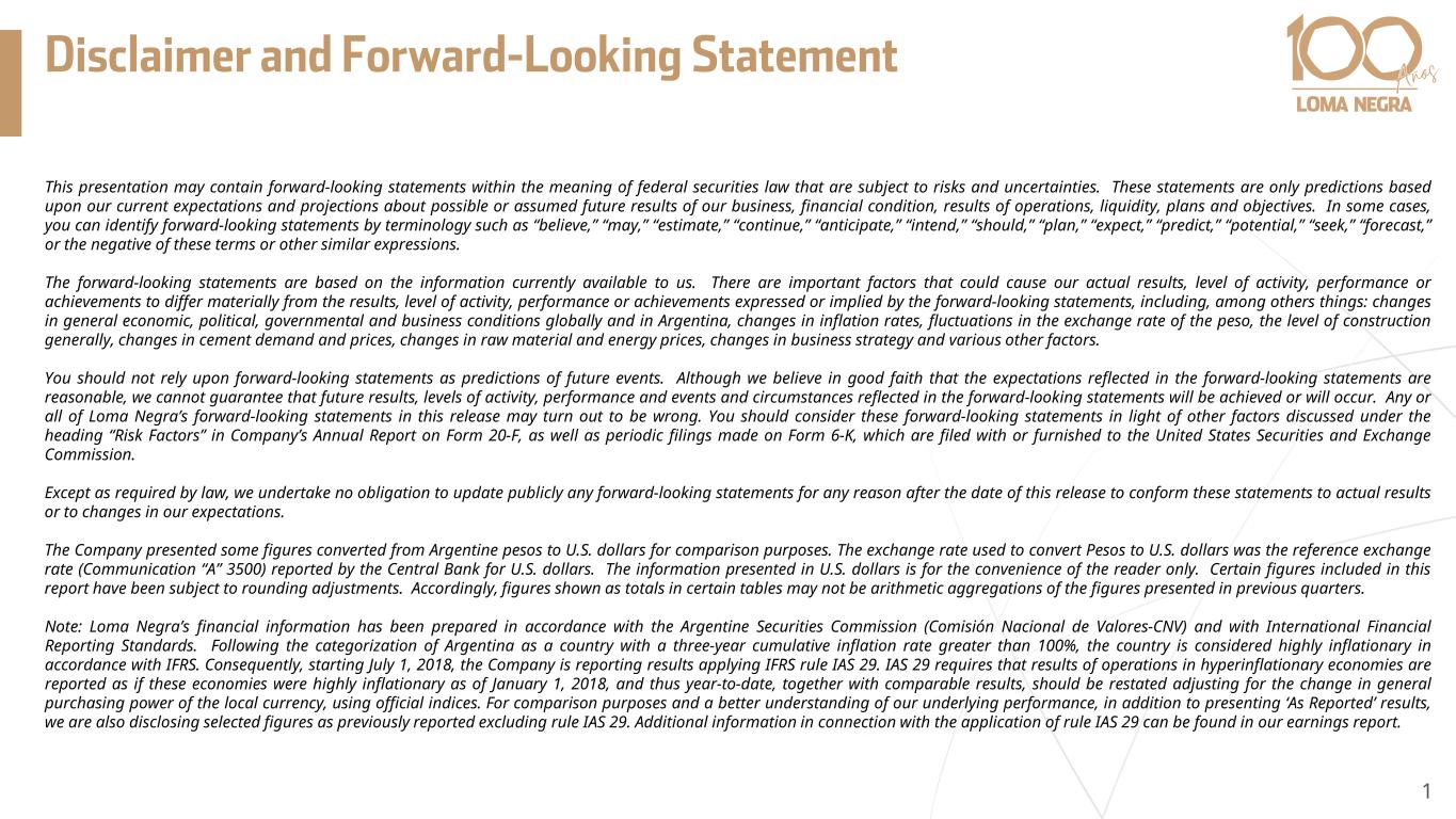 1 Disclaimer and Forward-Looking Statement This presentation may contain forward-looking statements within the meaning of federal securities law that are subject to risks and uncertainties. These statements are only predictions based upon our current expectations and projections about possible or assumed future results of our business, financial condition, results of operations, liquidity, plans and objectives. In some cases, you can identify forward-looking statements by terminology such as “believe,” “may,” “estimate,” “continue,” “anticipate,” “intend,” “should,” “plan,” “expect,” “predict,” “potential,” “seek,” “forecast,” or the negative of these terms or other similar expressions. The forward-looking statements are based on the information currently available to us. There are important factors that could cause our actual results, level of activity, performance or achievements to differ materially from the results, level of activity, performance or achievements expressed or implied by the forward-looking statements, including, among others things: changes in general economic, political, governmental and business conditions globally and in Argentina, changes in inflation rates, fluctuations in the exchange rate of the peso, the level of construction generally, changes in cement demand and prices, changes in raw material and energy prices, changes in business strategy and various other factors. You should not rely upon forward-looking statements as predictions of future events. Although we believe in good faith that the expectations reflected in the forward-looking statements are reasonable, we cannot guarantee that future results, levels of activity, performance and events and circumstances reflected in the forward-looking statements will be achieved or will occur. Any or all of Loma Negra’s forward-looking statements in this release may turn out to be wrong. You should consider these forward-looking statements in light of other factors discussed under the heading “Risk Factors” in Company’s Annual Report on Form 20-F, as well as periodic filings made on Form 6-K, which are filed with or furnished to the United States Securities and Exchange Commission. Except as required by law, we undertake no obligation to update publicly any forward-looking statements for any reason after the date of this release to conform these statements to actual results or to changes in our expectations. The Company presented some figures converted from Argentine pesos to U.S. dollars for comparison purposes. The exchange rate used to convert Pesos to U.S. dollars was the reference exchange rate (Communication “A” 3500) reported by the Central Bank for U.S. dollars. The information presented in U.S. dollars is for the convenience of the reader only. Certain figures included in this report have been subject to rounding adjustments. Accordingly, figures shown as totals in certain tables may not be arithmetic aggregations of the figures presented in previous quarters. Note: Loma Negra’s financial information has been prepared in accordance with the Argentine Securities Commission (Comisión Nacional de Valores-CNV) and with International Financial Reporting Standards. Following the categorization of Argentina as a country with a three-year cumulative inflation rate greater than 100%, the country is considered highly inflationary in accordance with IFRS. Consequently, starting July 1, 2018, the Company is reporting results applying IFRS rule IAS 29. IAS 29 requires that results of operations in hyperinflationary economies are reported as if these economies were highly inflationary as of January 1, 2018, and thus year-to-date, together with comparable results, should be restated adjusting for the change in general purchasing power of the local currency, using official indices. For comparison purposes and a better understanding of our underlying performance, in addition to presenting ‘As Reported’ results, we are also disclosing selected figures as previously reported excluding rule IAS 29. Additional information in connection with the application of rule IAS 29 can be found in our earnings report.