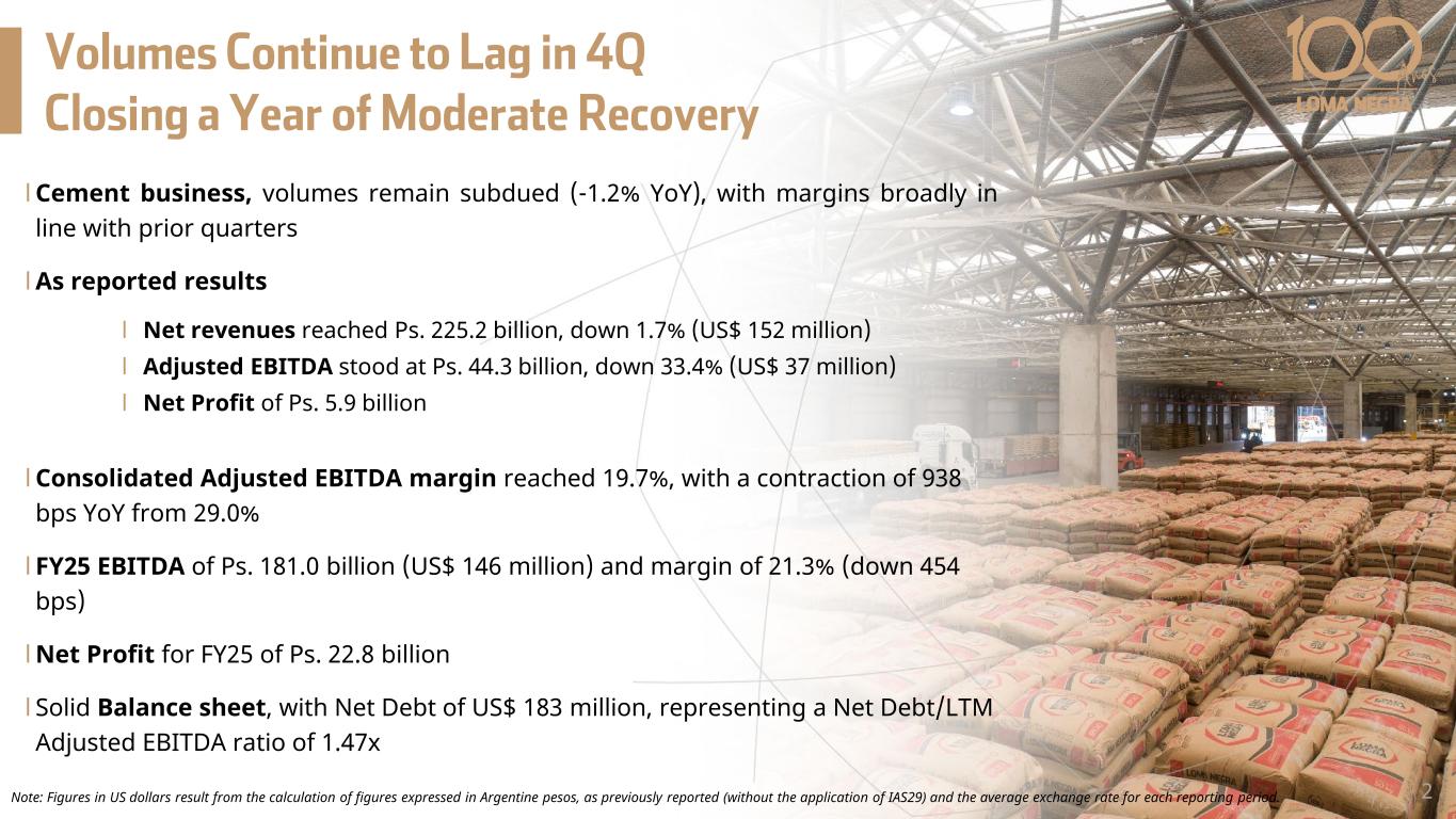 Volumes Continue to Lag in 4Q Closing a Year of Moderate Recovery l Cement business, volumes remain subdued (-1.2% YoY), with margins broadly in line with prior quarters l As reported results l Net revenues reached Ps. 225.2 billion, down 1.7% (US$ 152 million) l Adjusted EBITDA stood at Ps. 44.3 billion, down 33.4% (US$ 37 million) l Net Profit of Ps. 5.9 billion l Consolidated Adjusted EBITDA margin reached 19.7%, with a contraction of 938 bps YoY from 29.0% l FY25 EBITDA of Ps. 181.0 billion (US$ 146 million) and margin of 21.3% (down 454 bps) l Net Profit for FY25 of Ps. 22.8 billion l Solid Balance sheet, with Net Debt of US$ 183 million, representing a Net Debt/LTM Adjusted EBITDA ratio of 1.47x Note: Figures in US dollars result from the calculation of figures expressed in Argentine pesos, as previously reported (without the application of IAS29) and the average exchange rate for each reporting period. 2