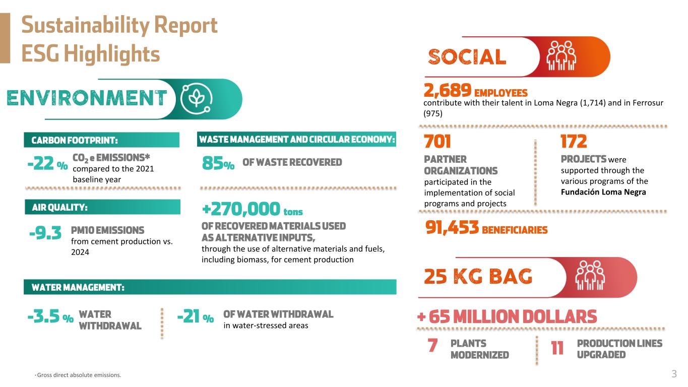 -22 % ENVIRONMENT CO2 e EMISSIONS* compared to the 2021 baseline year 85% OF WASTE RECOVERED +270,000 tons OF RECOVERED MATERIALS USED AS ALTERNATIVE INPUTS, through the use of alternative materials and fuels, including biomass, for cement production CARBON FOOTPRINT: WASTE MANAGEMENT AND CIRCULAR ECONOMY: WATER MANAGEMENT: -3.5 % WATER WITHDRAWAL -21 % OF WATER WITHDRAWAL in water-stressed areas * Gross direct absolute emissions. AIR QUALITY: -9.3 PM10 EMISSIONS from cement production vs. 2024 SOCIAL 2,689 EMPLOYEES contribute with their talent in Loma Negra (1,714) and in Ferrosur (975) 701 PARTNER ORGANIZATIONS participated in the implementation of social programs and projects 172 PROJECTS were supported through the various programs of the Fundación Loma Negra 91,453 BENEFICIARIES 25 KG BAG + 65 MILLION DOLLARS PLANTS MODERNIZED 7 PRODUCTION LINES UPGRADED11 Sustainability Report ESG Highlights 3
