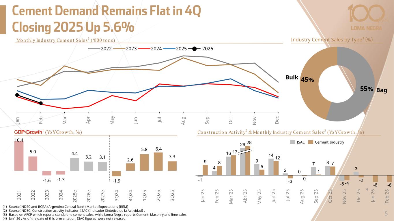 Cement Demand Remains Flat in 4Q Closing 2025 Up 5.6% 10.4 5.0 -1.6 -1.3 4.4 3.2 3.1 -1.9 2.6 5.8 6.4 3.3 20 21 20 22 20 23 20 24 20 25 e 20 26 e 20 27 e 3Q 24 4Q 24 1Q 25 2Q 25 3Q 25 GDP Growth1 (YoY Growth , %) Ap r Fe b Ja n M ar M ay N ovJu n Au g D ec Se p O ct 202620232022 2025 ro t Month ly Industry Cem ent Sa les3 (‘000 tons) 2024 -1 4 16 9 14 2 0 7 8 -5 3 9 8 17 5 12 -3 0 1 7 -4 -2 -6 -6 Ja n’ 25 Fe b’ 25 M ar ’2 5 Ab r’ 25 M ay ’2 5 Ju n’ 25 Ju l’2 5 Au g’ 25 Se p’ 25 O ct ’2 5 N ov ’2 5 D ic ’2 5 Ja n’ 26 26 28 Fe b’ 26 ISAC Cement Industry Ju l Industry Cement Sales by Type3 (%) Construct ion Act ivity2 & Month ly Industry Cem ent Sa les3 (YoY Growth , %) (1) Source INDEC and BCRA (Argentina Central Bank) Market Expectations (REM) (2) Source INDEC: Construction activity indicator, ISAC (Indicador Sintético de la Actividad) . (3) Based on AFCP which reports standalone cement sales, while Loma Negra reports Cement, Masonry and lime sales (4) Jan’ 26 : As of the date of this presentation, ISAC figures were not released 55% 45% Bag Bulk 4 5