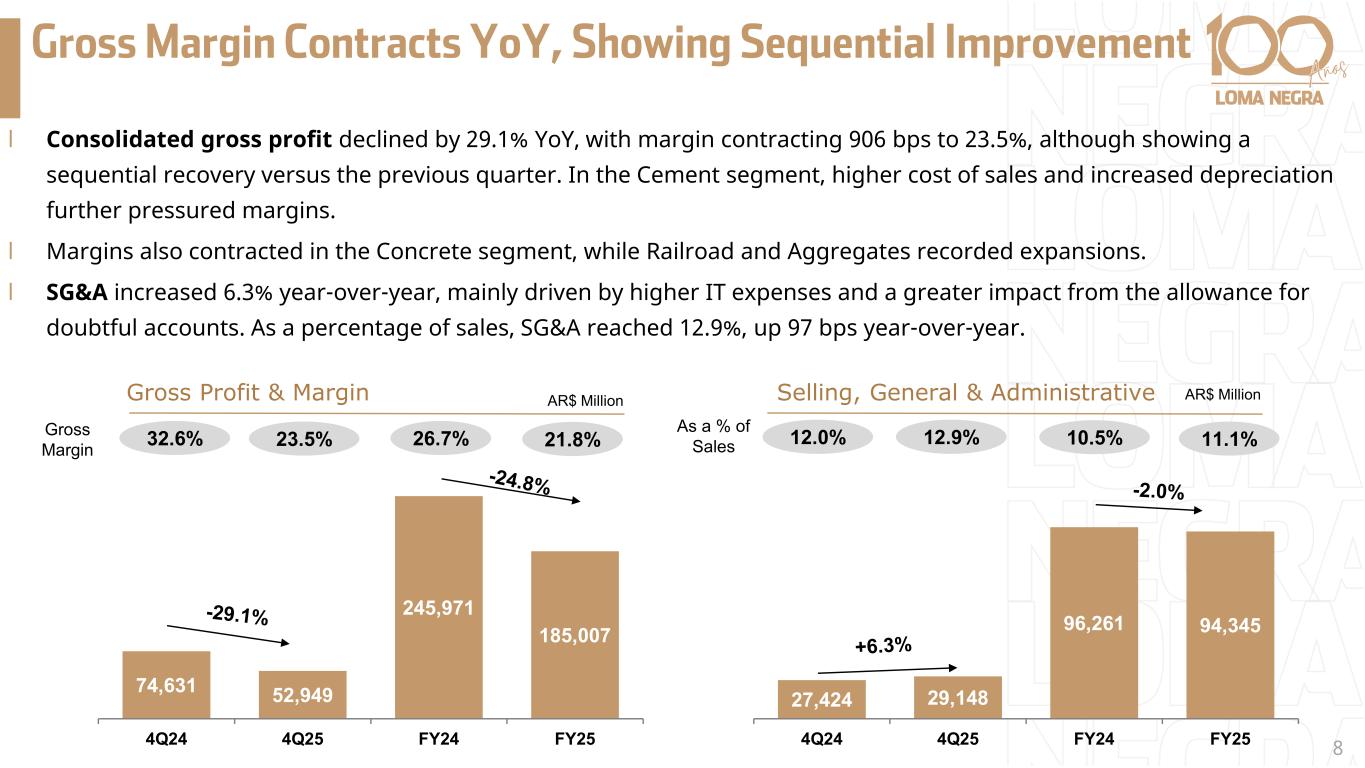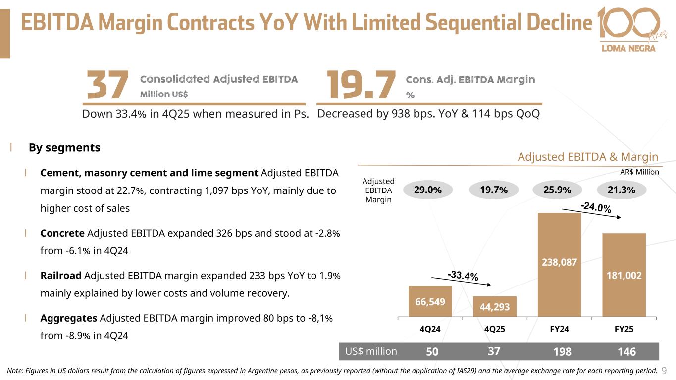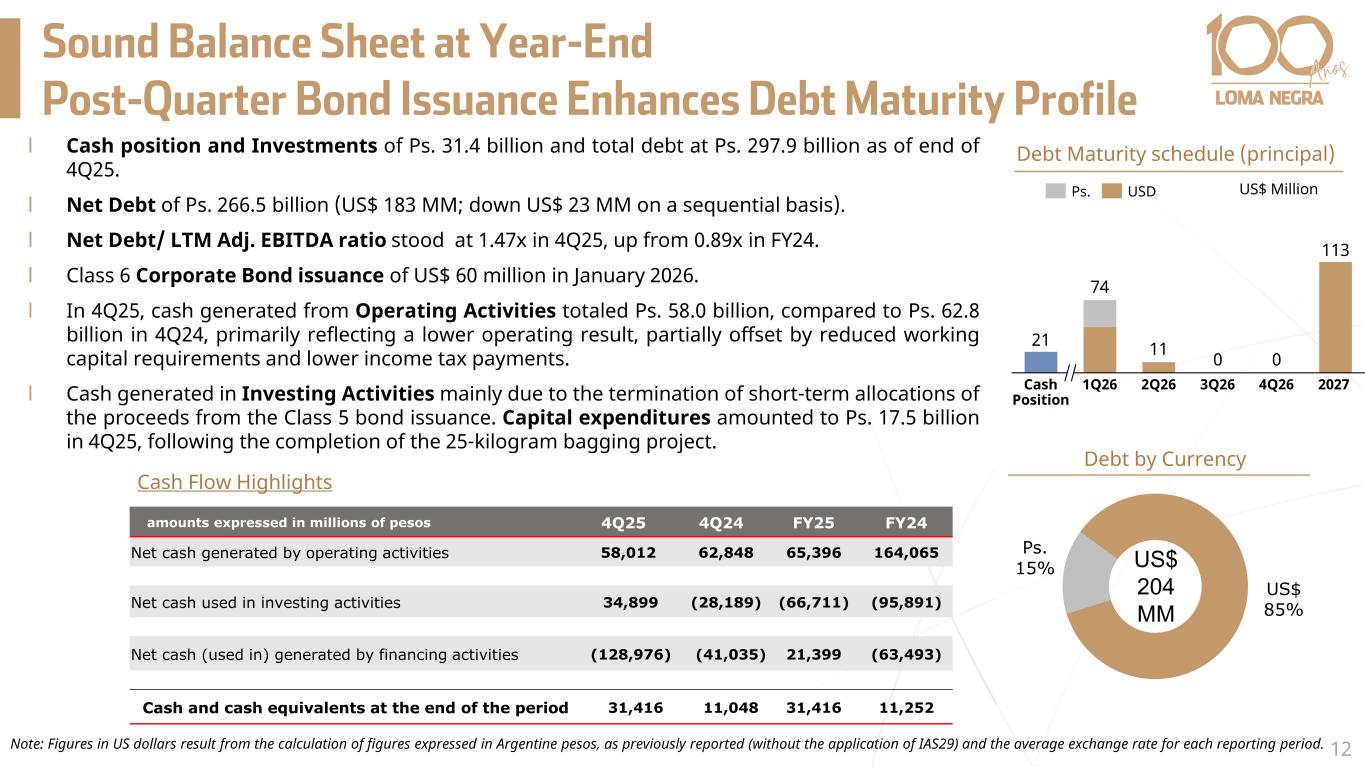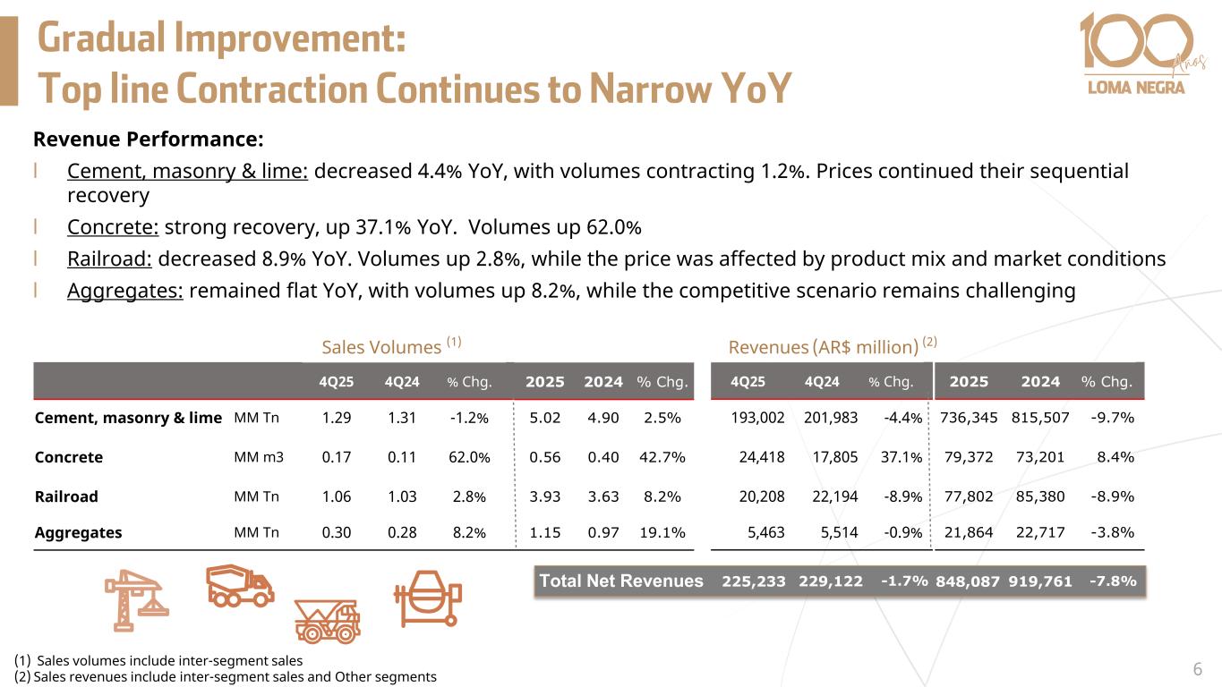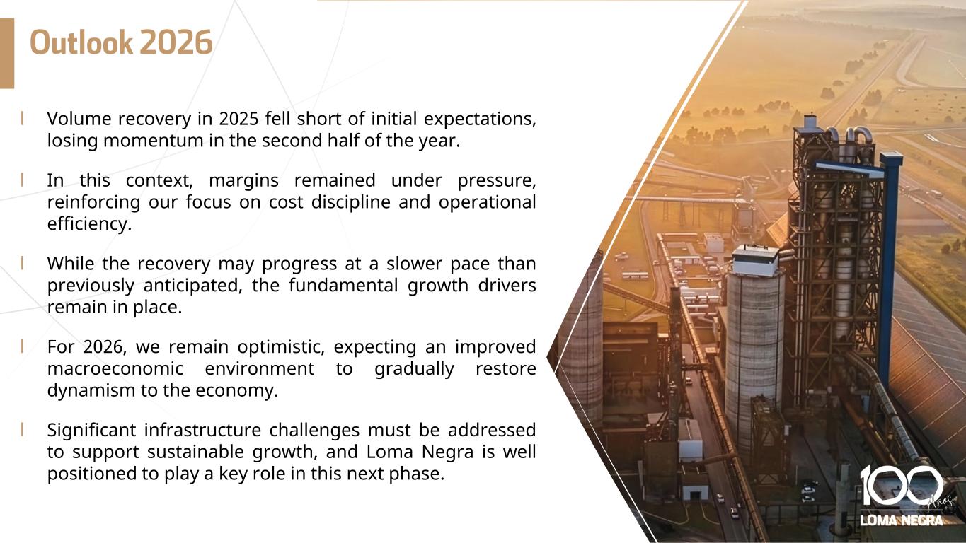 Outlook 2026 l Volume recovery in 2025 fell short of initial expectations, losing momentum in the second half of the year. l In this context, margins remained under pressure, reinforcing our focus on cost discipline and operational efficiency. l While the recovery may progress at a slower pace than previously anticipated, the fundamental growth drivers remain in place. l For 2026, we remain optimistic, expecting an improved macroeconomic environment to gradually restore dynamism to the economy. l Significant infrastructure challenges must be addressed to support sustainable growth, and Loma Negra is well positioned to play a key role in this next phase.