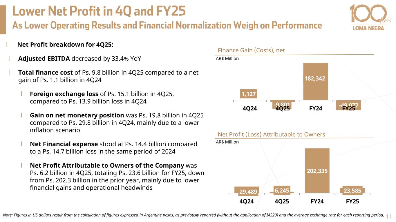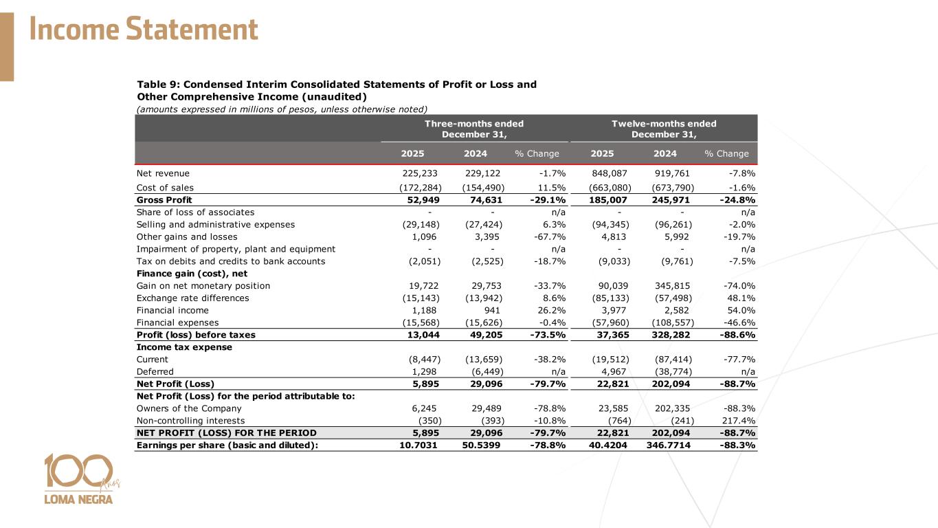 Income Statement (amounts expressed in millions of pesos, unless otherwise noted) 2025 2024 % Change 2025 2024 % Change Net revenue 225,233 229,122 -1.7% 848,087 919,761 -7.8% Cost of sales (172,284) (154,490) 11.5% (663,080) (673,790) -1.6% Gross Profit 52,949 74,631 -29.1% 185,007 245,971 -24.8% Share of loss of associates - - n/a - - n/a Selling and administrative expenses (29,148) (27,424) 6.3% (94,345) (96,261) -2.0% Other gains and losses 1,096 3,395 -67.7% 4,813 5,992 -19.7% Impairment of property, plant and equipment - - n/a - - n/a Tax on debits and credits to bank accounts (2,051) (2,525) -18.7% (9,033) (9,761) -7.5% Finance gain (cost), net Gain on net monetary position 19,722 29,753 -33.7% 90,039 345,815 -74.0% Exchange rate differences (15,143) (13,942) 8.6% (85,133) (57,498) 48.1% Financial income 1,188 941 26.2% 3,977 2,582 54.0% Financial expenses (15,568) (15,626) -0.4% (57,960) (108,557) -46.6% Profit (loss) before taxes 13,044 49,205 -73.5% 37,365 328,282 -88.6% Income tax expense Current (8,447) (13,659) -38.2% (19,512) (87,414) -77.7% Deferred 1,298 (6,449) n/a 4,967 (38,774) n/a Net Profit (Loss) 5,895 29,096 -79.7% 22,821 202,094 -88.7% Net Profit (Loss) for the period attributable to: Owners of the Company 6,245 29,489 -78.8% 23,585 202,335 -88.3% Non-controlling interests (350) (393) -10.8% (764) (241) 217.4% NET PROFIT (LOSS) FOR THE PERIOD 5,895 29,096 -79.7% 22,821 202,094 -88.7% Earnings per share (basic and diluted): 10.7031 50.5399 -78.8% 40.4204 346.7714 -88.3% Table 9: Condensed Interim Consolidated Statements of Profit or Loss and Other Comprehensive Income (unaudited) Three-months ended December 31, Twelve-months ended December 31,