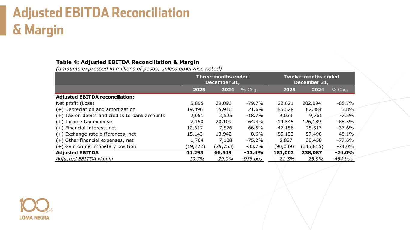 Adjusted EBITDA Reconciliation & Margin Table 4: Adjusted EBITDA Reconciliation & Margin (amounts expressed in millions of pesos, unless otherwise noted) 2025 2024 % Chg. 2025 2024 % Chg. Adjusted EBITDA reconciliation: Net profit (Loss) 5,895 29,096 -79.7% 22,821 202,094 -88.7% (+) Depreciation and amortization 19,396 15,946 21.6% 85,528 82,384 3.8% (+) Tax on debits and credits to bank accounts 2,051 2,525 -18.7% 9,033 9,761 -7.5% (+) Income tax expense 7,150 20,109 -64.4% 14,545 126,189 -88.5% (+) Financial interest, net 12,617 7,576 66.5% 47,156 75,517 -37.6% (+) Exchange rate differences, net 15,143 13,942 8.6% 85,133 57,498 48.1% (+) Other financial expenses, net 1,764 7,108 -75.2% 6,827 30,458 -77.6% (+) Gain on net monetary position (19,722) (29,753) -33.7% (90,039) (345,815) -74.0% Adjusted EBITDA 44,293 66,549 -33.4% 181,002 238,087 -24.0% Adjusted EBITDA Margin 19.7% 29.0% -938 bps 21.3% 25.9% -454 bps Three-months ended December 31, Twelve-months ended December 31,