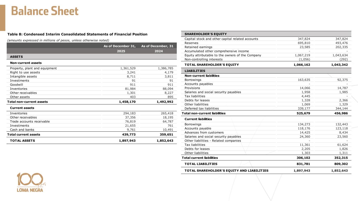 Balance Sheet As of December 31, As of December, 31 2025 2024 ASSETS Non-current assets Property, plant and equipment 1,361,529 1,386,785 Right to use assets 3,241 4,179 Intangible assets 8,711 3,811 Investments 91 91 Goodwill 911 911 Inventories 81,984 88,094 Other receivables 1,301 8,227 Other assets 403 895 Total non-current assets 1,458,170 1,492,992 Current assets Inventories 294,183 265,418 Other receivables 37,356 18,195 Trade accounts receivable 76,819 64,787 Investments 21,655 761 Cash and banks 9,761 10,491 Total current assets 439,773 359,651 TOTAL ASSETS 1,897,943 1,852,643 Table 8: Condensed Interim Consolidated Statements of Financial Position (amounts expressed in millions of pesos, unless otherwise noted) SHAREHOLDER'S EQUITY Capital stock and other capital related accounts 347,824 347,824 Reserves 695,810 493,476 Retained earnings 23,585 202,335 Accumulated other comprehensive income - - Equity attributable to the owners of the Company 1,067,219 1,043,634 Non-controlling interests (1,056) (292) TOTAL SHAREHOLDER'S EQUITY 1,066,162 1,043,342 LIABILITIES Non-current liabilities Borrowings 163,635 92,375 Accounts payables - - Provisions 14,066 14,787 Salaries and social security payables 1,958 1,985 Tax liabilities 4,445 - Debts for leases 1,328 2,366 Other liabilities 1,069 1,329 Deferred tax liabilities 339,177 344,144 Total non-current liabilities 525,679 456,986 Current liabilities Borrowings 134,273 132,443 Accounts payable 118,176 123,118 Advances from customers 14,425 8,434 Salaries and social security payables 24,360 23,560 Other liabilities - Related companies - - Tax liabilities 11,361 61,624 Debts for leases 2,205 1,826 Other liabilities 1,303 1,311 Total current liabilities 306,102 352,315 TOTAL LIABILITIES 831,781 809,302 TOTAL SHAREHOLDER'S EQUITY AND LIABILITIES 1,897,943 1,852,643