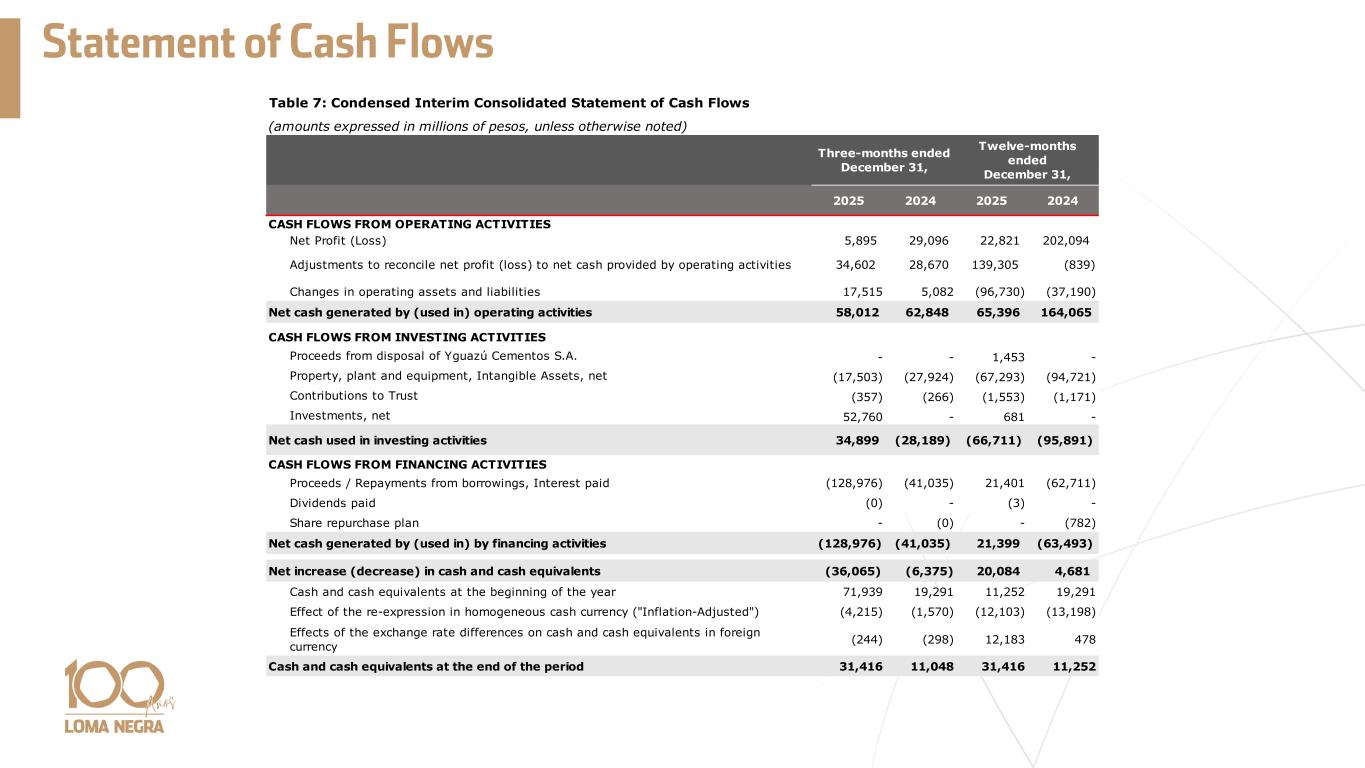 Statement of Cash Flows Table 7: Condensed Interim Consolidated Statement of Cash Flows (amounts expressed in millions of pesos, unless otherwise noted) 2025 2024 2025 2024 CASH FLOWS FROM OPERATING ACTIVITIES    Net Profit (Loss) 5,895 29,096 22,821 202,094 Adjustments to reconcile net profit (loss) to net cash provided by operating activities    34,602 28,670 139,305 (839) Changes in operating assets and liabilities    17,515 5,082 (96,730) (37,190) Net cash generated by (used in) operating activities    58,012 62,848 65,396 164,065    CASH FLOWS FROM INVESTING ACTIVITIES    Proceeds from disposal of Yguazú Cementos S.A.    - - 1,453 - Property, plant and equipment, Intangible Assets, net    (17,503) (27,924) (67,293) (94,721) Contributions to Trust    (357) (266) (1,553) (1,171) Investments, net 52,760 - 681 - Net cash used in investing activities    34,899 (28,189) (66,711) (95,891)    CASH FLOWS FROM FINANCING ACTIVITIES    Proceeds / Repayments from borrowings, Interest paid    (128,976) (41,035) 21,401 (62,711) Dividends paid (0) - (3) - Share repurchase plan - (0) - (782) Net cash generated by (used in) by financing activities    (128,976) (41,035) 21,399 (63,493)    Net increase (decrease) in cash and cash equivalents    (36,065) (6,375) 20,084 4,681 Cash and cash equivalents at the beginning of the year    71,939 19,291 11,252 19,291 Effect of the re-expression in homogeneous cash currency ("Inflation-Adjusted") (4,215) (1,570) (12,103) (13,198) Effects of the exchange rate differences on cash and cash equivalents in foreign currency    (244) (298) 12,183 478 Cash and cash equivalents at the end of the period    31,416 11,048 31,416 11,252 Twelve-months ended December 31, Three-months ended December 31,