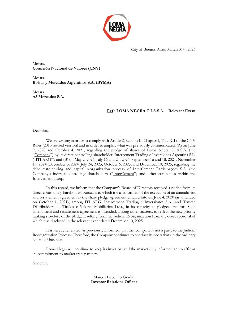 City of Buenos Aires, March 31st , 2026 Messrs. Comisión Nacional de Valores (CNV) Messrs. Bolsas y Mercados Argentinos S.A. (BYMA) Messrs. A3 Mercados S.A. Ref.: LOMA NEGRA C.I.A.S.A. – Relevant Event Dear Sirs, We are writing in order to comply with Article 2, Section II, Chapter I, Title XII of the CNV Rules (2013 revised version) and in order to amplify what was previously communicated: (A) on June 9, 2020 and October 4, 2021, regarding the pledge of shares of Loma Negra C.I.A.S.A. (the “Company”) by its direct controlling shareholder, Intercement Trading e Inversiones Argentina S.L. (“ITI ARG”); and (B) on May 2, 2024, July 16 and 24, 2024, September 16 and 18, 2024, November 19, 2024, December 3, 2024, July 24, 2025, October 6, 2025, and December 10, 2025, regarding the debt restructuring and capital reorganization process of InterCement Participações S.A. (the Company’s indirect controlling shareholder) (“InterCement”) and other companies within the Intercement group. In this regard, we inform that the Company’s Board of Directors received a notice from its direct controlling shareholder, pursuant to which it was informed of the execution of an amendment and restatement agreement to the share pledge agreement entered into on June 4, 2020 (as amended on October 1, 2021), among ITI ARG, Intercement Trading e Inversiones S.A., and Trustee Distribuidora de Títulos e Valores Mobiliários Ltda., in its capacity as pledgee creditor. Such amendment and restatement agreement is intended, among other matters, to reflect the new priority ranking structure of the pledge resulting from the Judicial Reorganization Plan, the court approval of which was disclosed in the relevant event dated December 10, 2025. It is hereby reiterated, as previously informed, that the Company is not a party to the Judicial Reorganization Process. Therefore, the Company continues to conduct its operations in the ordinary course of business. Loma Negra will continue to keep its investors and the market duly informed and reaffirms its commitment to market transparency. Sincerely, ___________________ Marcos Isabelino Gradin Investor Relations Officer