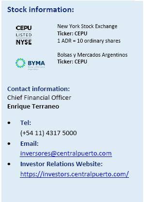 The Company will also host a live audio webcast of the conference call on the Investor Relations section of the Company's website at www.centralpuerto.com. Please allow extra time prior to the call to visit the website and download any streaming media software that might be required to listen to the webcast. The call will be available for replay on the Company’s website under the Investor Relations section.
