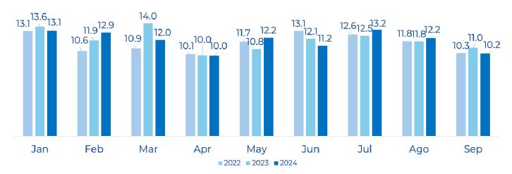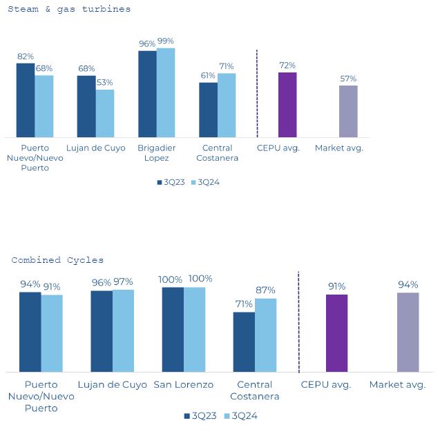 Finally, there was an increase in thermal generation to cope with higher energy demand. Despite the slight decrease in availability (71% on average during the 3Q24 vs 73% on average during the same period of 2023), generation rose 13% YoY. The growth in thermal generation led to higher fuel consumption: 66% of gas oil, 9% of natural gas and 3% fuel oil. The breakdown of availability levels shows that combined cycles figures increased 4%, from 90% to 94%, while gas and steam turbines decreased 4%, from 61% to 57%.