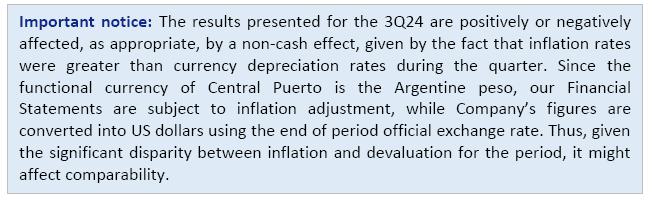 Definitions and terms used herein are provided in the Glossary at the end of this document. This release does not contain all the Company’s financial information. As a result, investors should read this release in conjunction with Central Puerto’s consolidated financial statements as of and for the period ended on September 30th, 2024, and the notes thereto, which will be available on the Company’s website.