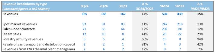 During 3Q24, revenues totaled US$185 million, increasing 14% or US$23 million compared to US$162 million in 3Q23.