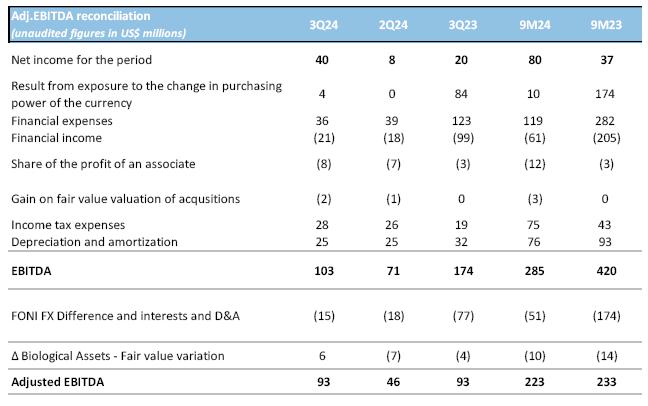 Consequently, Consolidated Adjusted EBITDA ([1]) amounted to US$93 million in 3Q24, compared to US$93 million in 3Q23.