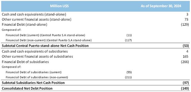 The following chart breaks down the Net Debt position of Central Puerto (on a stand-alone basis) and its subsidiaries: