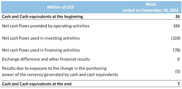 The net decrease in cash and cash equivalents was US$12 million. The exchange difference and other financial results was US$0.5 million while the monetary loss on cash and cash equivalents due to the change in purchasing power of the currency was US$4 million. Hence, given that Cash and cash equivalents as of January 1, 2024, was US$24 million, as of September 30, 2024 it ended-up at US$7 million.