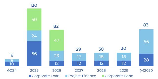 Net cash provided by operating activities was US$184 million during 9M24. This cash flow arises mainly from (i) US$165 million of net income for the period before income tax; (ii) US$30 million in collection of interest from clients; (iii) adjustments to reconcile profit for the period before income tax with net cash flows of US$22 million; and (iv) US$1 million in insurance recovery; partially offset by (v) US$21 million in working capital variations (accounts payables, accounts receivables, inventory, and other non-financial assets and liabilities); and (vi) US$13 million in income tax and other taxes payments.