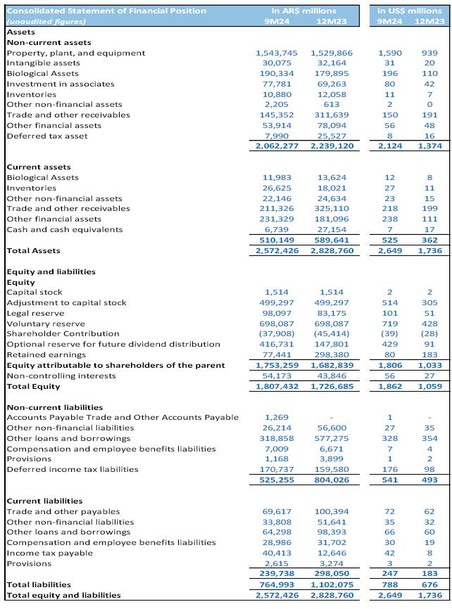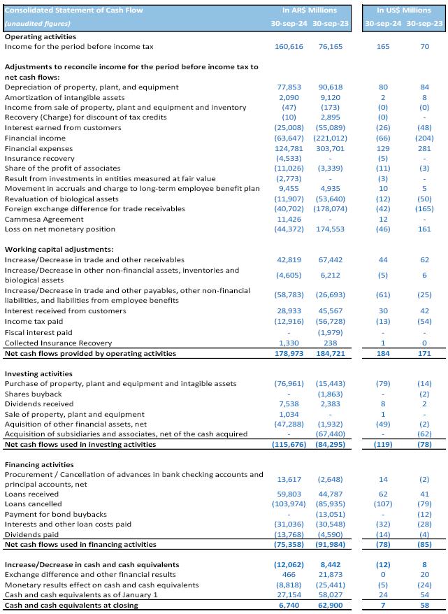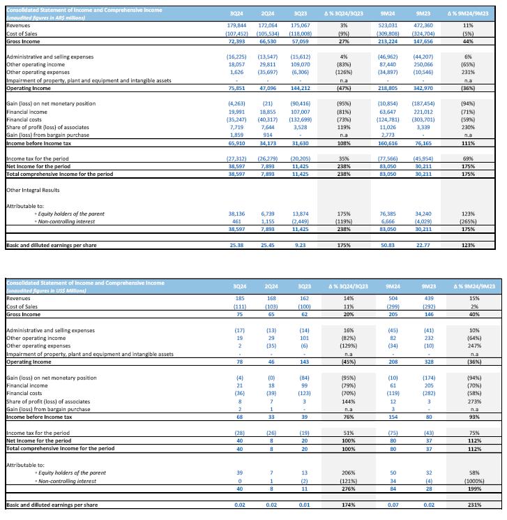 Financial statements as of September 30th, 2024, include the effects of the inflation adjustment, applying IAS 29. Accordingly, the financial statements have been stated in terms of the measuring unit current at the end of the reporting period, including the corresponding financial figures for previous periods reported for comparative purposes. Growth comparisons refer to the same periods of the previous year, measured in the current unit at the end of the period, unless otherwise stated. Consequently, the information included in the Financial Statements for the period ended on September 30th, 2024, is not comparable to the Financial Statements previously published by the company. However, we presented some figures converted from Argentine Pesos to U.S. dollars for comparison purposes only. The exchange rate used to convert Argentine Pesos to U.S. dollars was the reference exchange rate (Communication “A” 3500) reported by the Central Bank for U.S. dollars for the end of each period. The information presented in U.S. dollars is for the convenience of the reader only and may defer if such conversion for each period is performed at the exchange rate applicable at the end of the latest period. You should not consider these translations to be representations that the Argentine Peso amounts actually represent these U.S. dollars amounts or could be converted into U.S. dollars at the rate indicated.