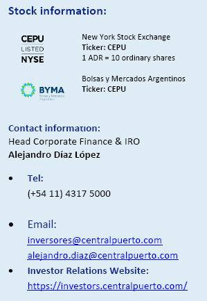 The Company will also host a live audio webcast of the conference call on the Investor Relations section of the Company's website at www.centralpuerto.com. Please allow extra time prior to the call to visit the website and download any streaming media software that might be required to listen to the webcast. The call will be available for replay on the Company’s website under the Investor Relations section.