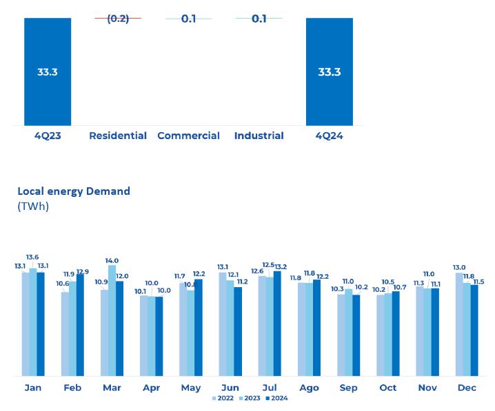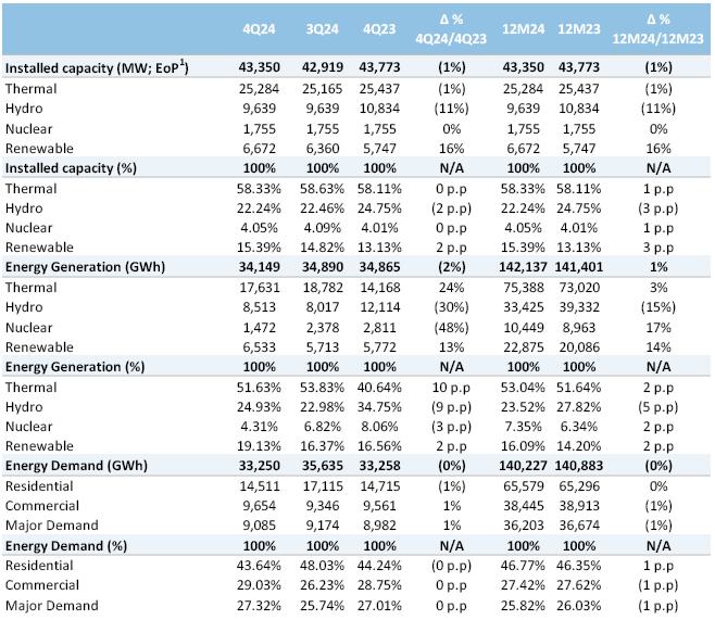 Power generation & demand: During 4Q24, energy demand reached 33,250 GWh, a slight decrease from the 33,258 GWh recorded during the 4Q24. There was a 1% decrease in residential consumption almost offset by commercial (+1%) and major demand (+1%). Higher temperatures recorded during October 2024 vis-à-vis same month of 2023 prompted higher retail consumption, which shrank in November and December as a result of milder temperatures compared to equal months of 2023.