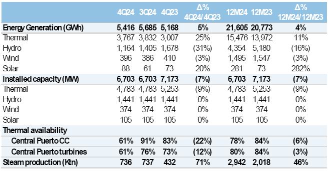 The table below sets forth key operating metrics of the Central Puerto group for 4Q24, compared to 3Q24 and 4Q23 and FY 2024, compared to FY 2023: