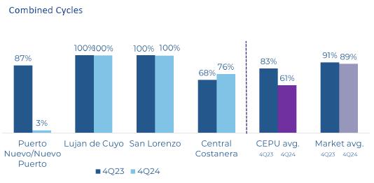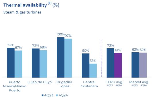 Thermal generation increased 25% during 4Q24 compared to 4Q23, reaching 3,767 GWh from 3,007 GWh. The growth was mainly due to higher dispatch of some steam turbines in Puerto site and some steam and gas turbines in Luján de Cuyo, as well as higher generation of the Brigadier Lopez open cycle and the combined cycle of Santa Fe. Also, a higher availability and dispatch were recorded for the Mitsubishi combined cycle located in Costanera site. During the quarter some maintenance programs were carried out in steam turbines and combined cycles. It is worth to be mentioned those executed in the combined cycle located in Nuevo Puerto (Puerto site); one unit of the Mitsubishi combined cycle, located in Costanera site and some steam turbines of Puerto site.
