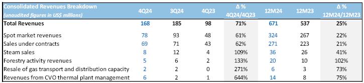 During 4Q24, revenues totaled US$168 million, increasing 71% or US$70 million compared to US$98 million in 4Q23.