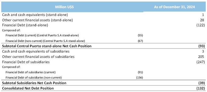 The following chart breaks down the Net Debt position of Central Puerto (on a stand-alone basis) and its subsidiaries: