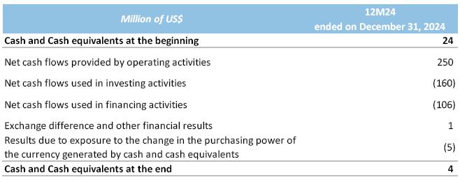 The net decrease in cash and cash equivalents was US$16 million during 12M24. The exchange difference and other financial results was US$1 million while the monetary loss on cash and cash equivalents due to the change in purchasing power of the currency was US$10 million. Hence, given that Cash and cash equivalents as of January 1, 2024, was US$28 million, as of December 31, 2024 it ended-up at US$4 million.