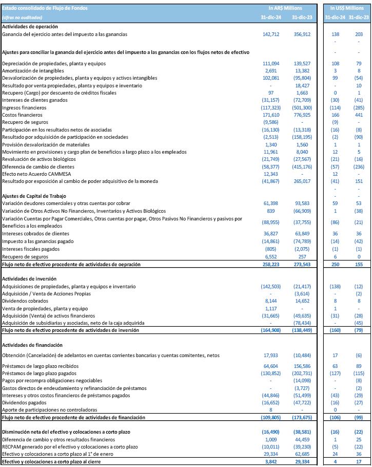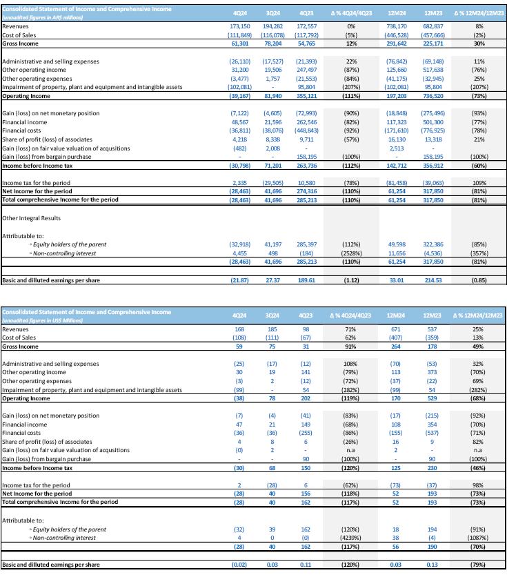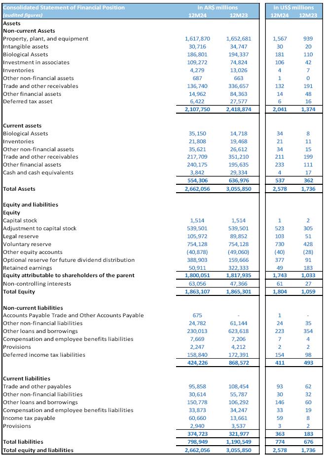 Financial statements as of December 31st, 2024, include the effects of the inflation adjustment, applying IAS 29. Accordingly, the financial statements have been stated in terms of the measuring unit current at the end of the reporting period, including the corresponding financial figures for previous periods reported for comparative purposes. Growth comparisons refer to the same periods of the previous year, measured in the current unit at the end of the period, unless otherwise stated. Consequently, the information included in the Financial Statements for the fiscal year ended on December 31st, 2024, is not comparable to the Financial Statements previously published by the company. However, we presented some figures converted from Argentine Pesos to U.S. dollars for comparison purposes only. The exchange rate used to convert Argentine Pesos to U.S. dollars was the reference exchange rate (Communication “A” 3500) reported by the Central Bank for U.S. dollars for the end of each period. The information presented in U.S. dollars is for the convenience of the reader only and may defer if such conversion for each period is performed at the exchange rate applicable at the end of the latest period. You should not consider these translations to be representations that the Argentine Peso amounts actually represent these U.S. dollars amounts or could be converted into U.S. dollars at the rate indicated.