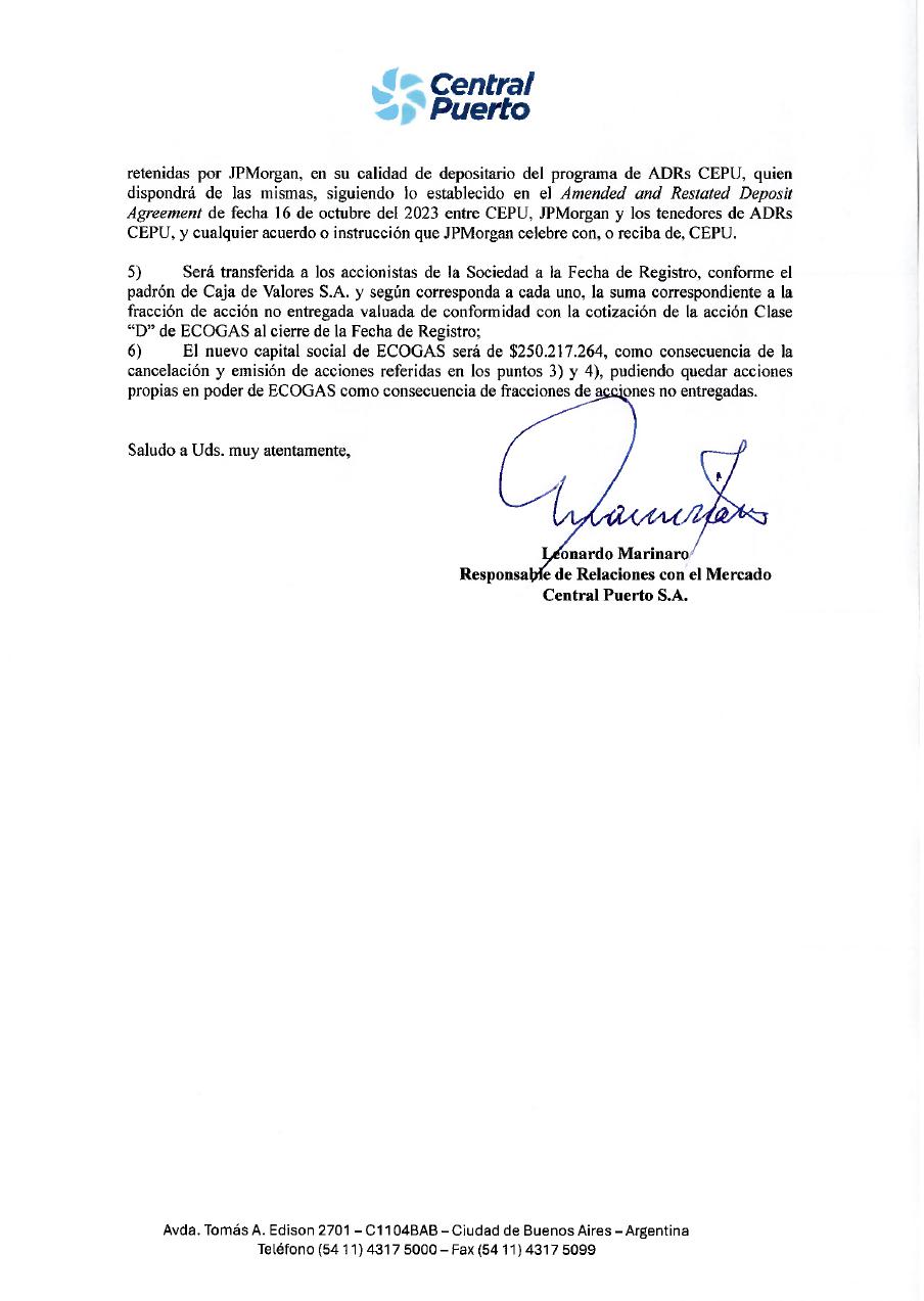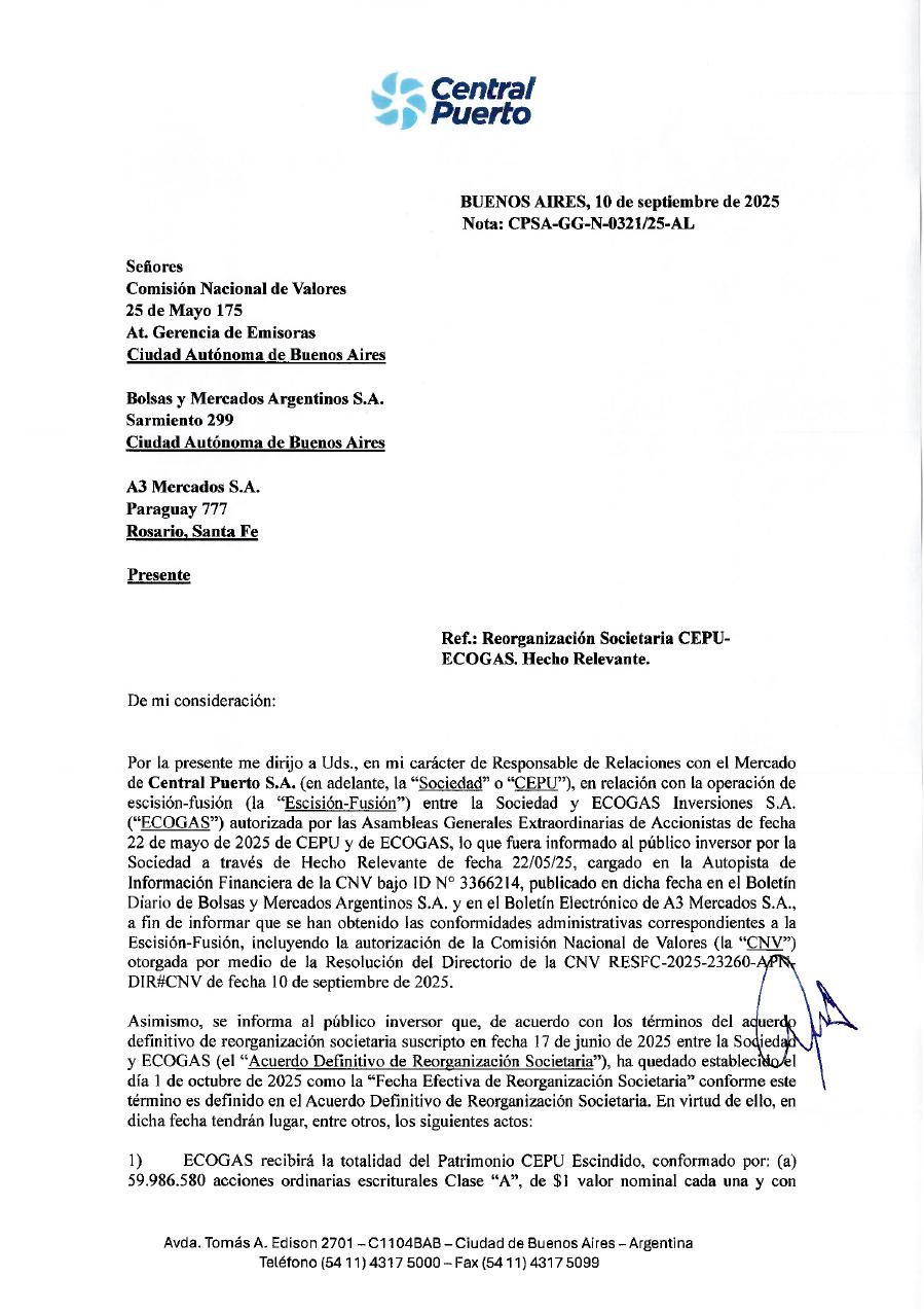I am pleased to write to you, in my capacity as Head of Market Relations of Central Puerto S.A. (hereinafter, the "Company" or "CEPU"), in relation to the spin-off-merger operation (the "Spin-off-Merger") between the Company and ECOGAS Inversiones S.A. ("ECOGAS") authorized by the Extraordinary General Shareholders' Meetings of CEPU and ECOGAS on May 22, 2025, which was informed to the market by the Company through a Relevant Fact dated 05/22/2025, filed in CNV Argentina and SEC, under ID No. 3366214, published on that date in the Daily Bulletin of Bolsas y Mercados Argentinos S.A. and in the Electronic Bulletin of A3 Mercados S.A., in order to inform that the administrative conformities corresponding to the Spin-Off-Merger have been obtained, including the authorization of the National Securities Commission (the "CNV") granted by means of Resolution No. [●] dated 10 September 2025.