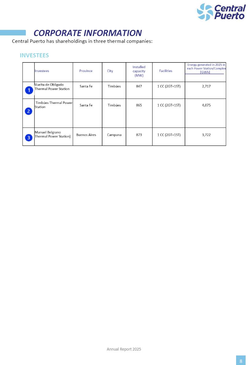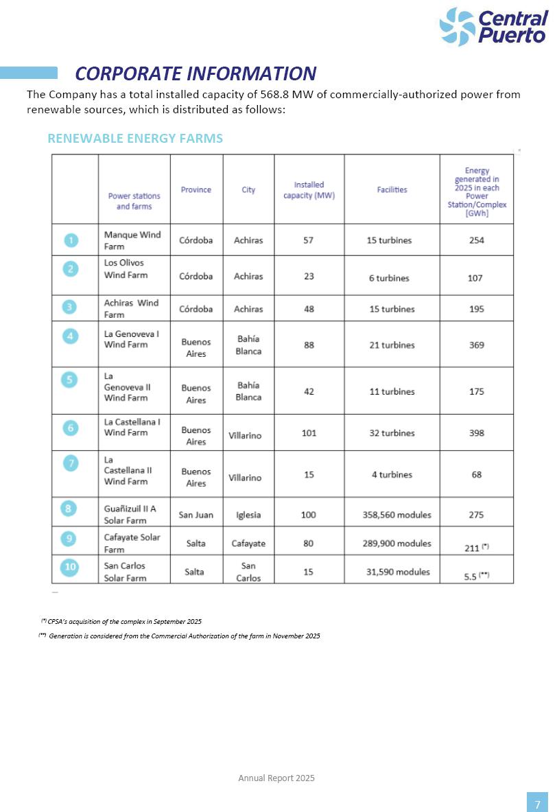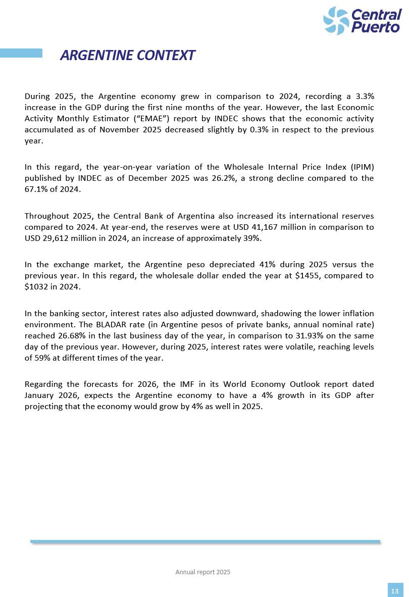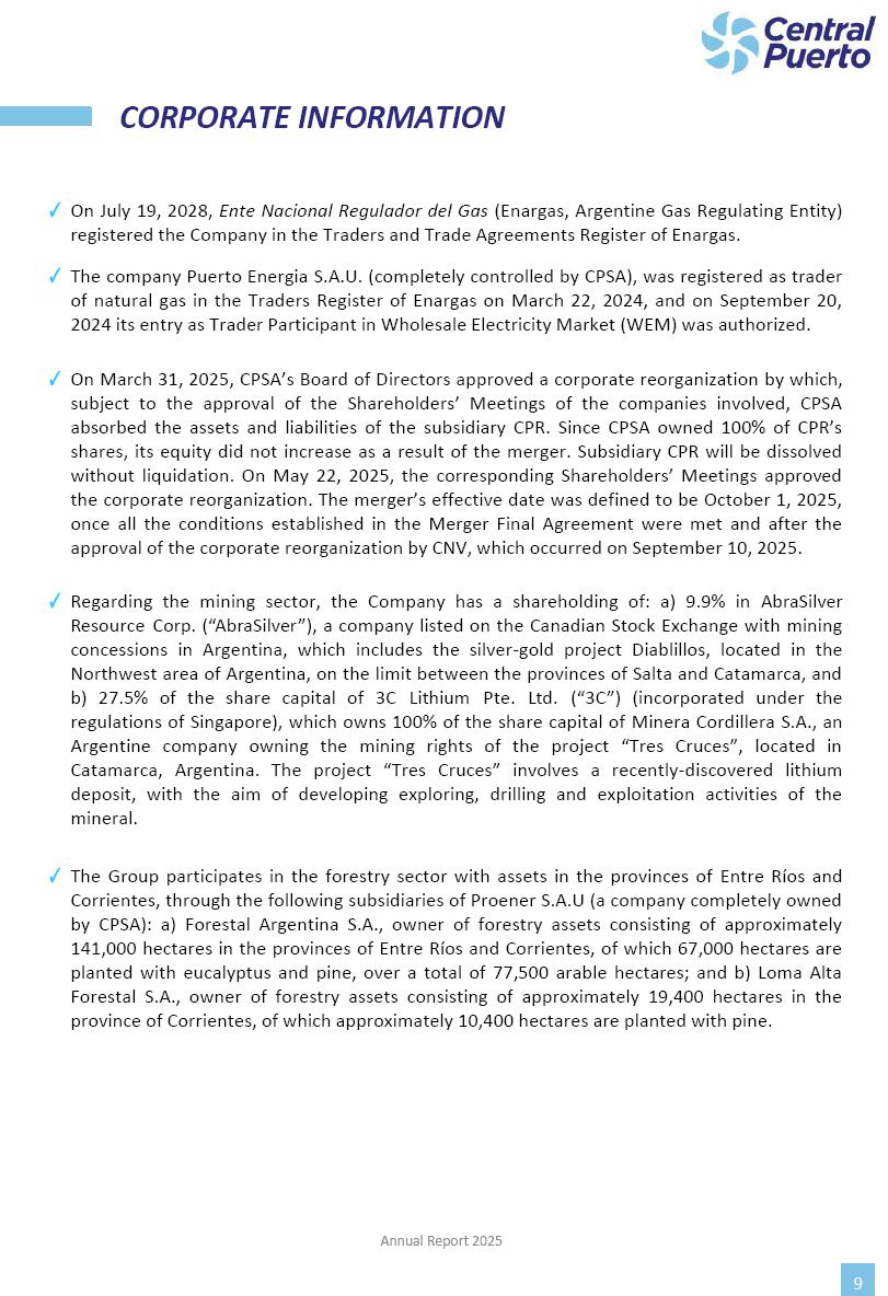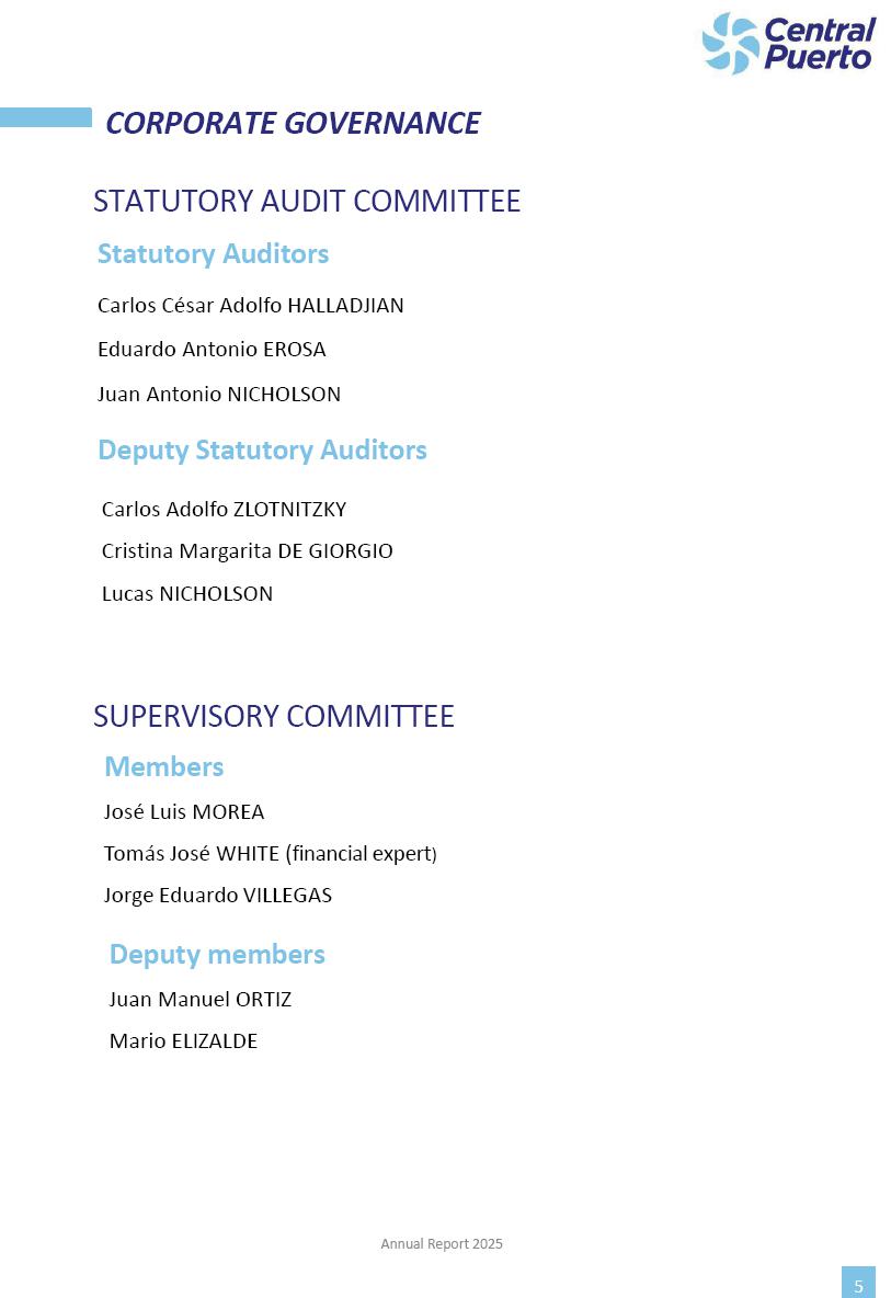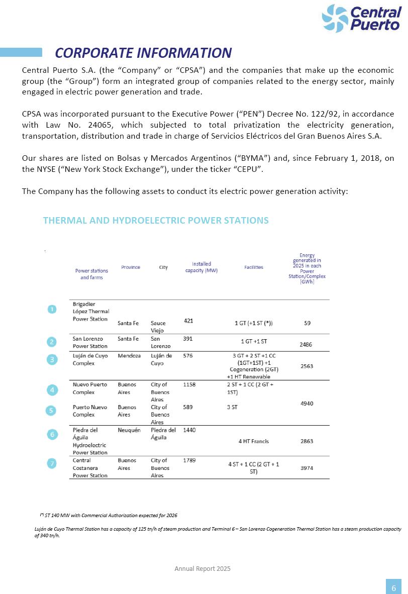 Annual Report Central Puerto December 2025 2 CONTENT 1. Company’s overview Corporate Governance Board of Directors, Statutory Audit Committee and Supervisory Committee Corporate information 2. Macroeconomic context 3. The Argentine Wholesale Electricity Market Trade Agreements in the forward market Liquid fuels and natural gas 4. Maintenance Puerto Nuevo & Nuevo Puerto Site Mendoza Piedra del Águila Site Brigadier López Site San Lorenzo Site – Terminal 6 5. Human Resource 6. Environment, Health & Safety and Quality Commitment Policy Environment Health & Safety Quality 7. Finances General remarks Outlook for the current fiscal year Allocation of fiscal year results Financial performance 01 Company’s overview CORPORATE GOVERNANCE Annual Report 2025 4 Directors Osvaldo Arturo RECA (Chairman) Miguel DODERO (Vice-Chairman) José Luis MOREA Tomás José WHITE Marcelo Atilio SUVA Jorge Eduardo VILLEGAS Martina BLANCO Diego Gustavo PETRACCHI Martín LHEZ Deputy Directors Fernando Roberto BONNET José Manuel ORTIZ Adrián Gustavo SALVATORE Martín OROZCO Mario ELIZALDE José Manuel PAZOS Alejo VILLEGAS Ramón Nazareno ULLOA CORPORATE GOVERNANCE Annual Report 2025 5 STATUTORY AUDIT COMMITTEE Statutory Auditors Carlos César Adolfo HALLADJIAN Eduardo Antonio EROSA Juan Antonio NICHOLSON Deputy Statutory Auditors Carlos Adolfo ZLOTNITZKY Cristina Margarita DE GIORGIO Lucas NICHOLSON SUPERVISORY COMMITTEE Members José Luis MOREA Tomás José WHITE (financial expert) Jorge Eduardo VILLEGAS Deputy members Juan Manuel ORTIZ Mario ELIZALDE Annual Report 2025 6 CORPORATE INFORMATION Central Puerto S.A. (the “Company” or “CPSA”) and the companies that make up the economic group (the “Group”) form an integrated group of companies related to the energy sector, mainly engaged in electric power generation and trade. CPSA was incorporated pursuant to the Executive Power (“PEN”) Decree No. 122/92, in accordance with Law No. 24065, which subjected to total privatization the electricity generation, transportation, distribution and trade in charge of Servicios Eléctricos del Gran Buenos Aires S.A. Our shares are listed on Bolsas y Mercados Argentinos (“BYMA”) and, since February 1, 2018, on the NYSE (“New York Stock Exchange”), under the ticker “CEPU”. The Company has the following assets to conduct its electric power generation activity: THERMAL AND HYDROELECTRIC POWER STATIONS (*) ST 140 MW with Commercial Authorization expected for 2026 Luján de Cuyo Thermal Station has a capacity of 125 tn/h of steam production and Terminal 6 – San Lorenzo Cogeneration Thermal Station has a steam production capacity of 340 tn/h. Annual Report 2025 7 CORPORATE INFORMATION The Company has a total installed capacity of 568.8 MW of commercially-authorized power from renewable sources, which is distributed as follows: RENEWABLE ENERGY FARMS (*) CPSA’s acquisition of the complex in September 2025 (**) Generation is considered from the Commercial Authorization of the farm in November 2025 Annual Report 2025 8 CORPORATE INFORMATION Central Puerto has shareholdings in three thermal companies: INVESTEES Annual Report 2025 9 CORPORATE INFORMATION ✓ On July 19, 2028, Ente Nacional Regulador del Gas (Enargas, Argentine Gas Regulating Entity) registered the Company in the Traders and Trade Agreements Register of Enargas. ✓ The company Puerto Energia S.A.U. (completely controlled by CPSA), was registered as trader of natural gas in the Traders Register of Enargas on March 22, 2024, and on September 20, 2024 its entry as Trader Participant in Wholesale Electricity Market (WEM) was authorized. ✓ On March 31, 2025, CPSA’s Board of Directors approved a corporate reorganization by which, subject to the approval of the Shareholders’ Meetings of the companies involved, CPSA absorbed the assets and liabilities of the subsidiary CPR. Since CPSA owned 100% of CPR’s shares, its equity did not increase as a result of the merger. Subsidiary CPR will be dissolved without liquidation. On May 22, 2025, the corresponding Shareholders’ Meetings approved the corporate reorganization. The merger’s effective date was defined to be October 1, 2025, once all the conditions established in the Merger Final Agreement were met and after the approval of the corporate reorganization by CNV, which occurred on September 10, 2025. ✓ Regarding the mining sector, the Company has a shareholding of: a) 9.9% in AbraSilver Resource Corp. (“AbraSilver”), a company listed on the Canadian Stock Exchange with mining concessions in Argentina, which includes the silver-gold project Diablillos, located in the Northwest area of Argentina, on the limit between the provinces of Salta and Catamarca, and b) 27.5% of the share capital of 3C Lithium Pte. Ltd. (“3C”) (incorporated under the regulations of Singapore), which owns 100% of the share capital of Minera Cordillera S.A., an Argentine company owning the mining rights of the project “Tres Cruces”, located in Catamarca, Argentina. The project “Tres Cruces” involves a recently-discovered lithium deposit, with the aim of developing exploring, drilling and exploitation activities of the mineral. ✓ The Group participates in the forestry sector with assets in the provinces of Entre Ríos and Corrientes, through the following subsidiaries of Proener S.A.U (a company completely owned by CPSA): a) Forestal Argentina S.A., owner of forestry assets consisting of approximately 141,000 hectares in the provinces of Entre Ríos and Corrientes, of which 67,000 hectares are planted with eucalyptus and pine, over a total of 77,500 arable hectares; and b) Loma Alta Forestal S.A., owner of forestry assets consisting of approximately 19,400 hectares in the province of Corrientes, of which approximately 10,400 hectares are planted with pine. Annual Report 2025 10 CORPORATE INFORMATION ✓ Finally, the Group was involved in the natural gas distribution sector in the regions of Cuyo 