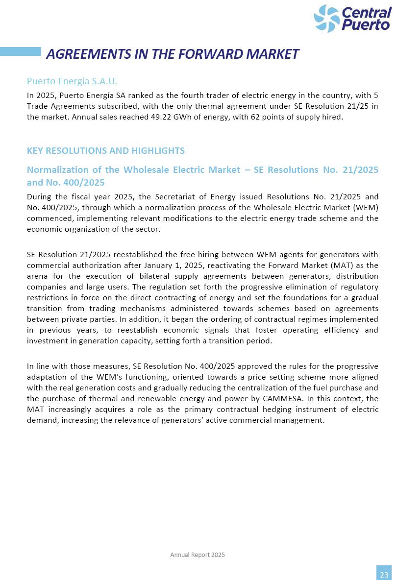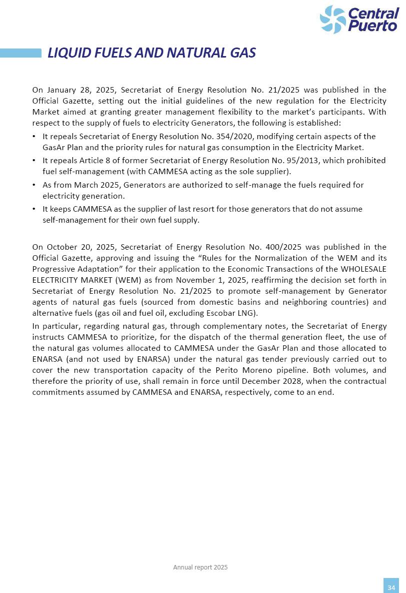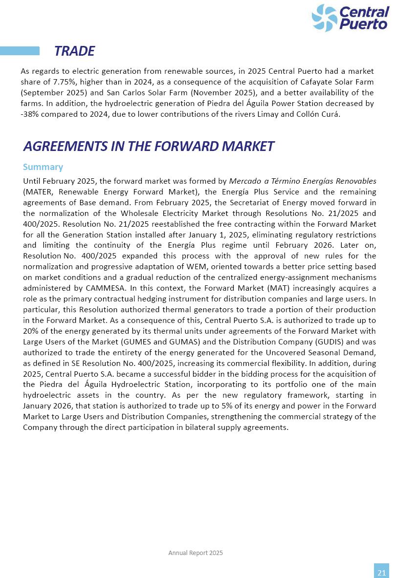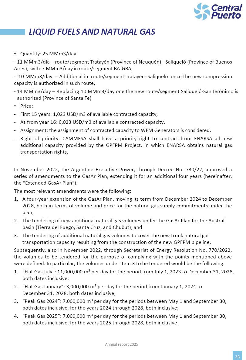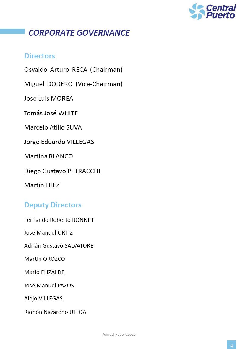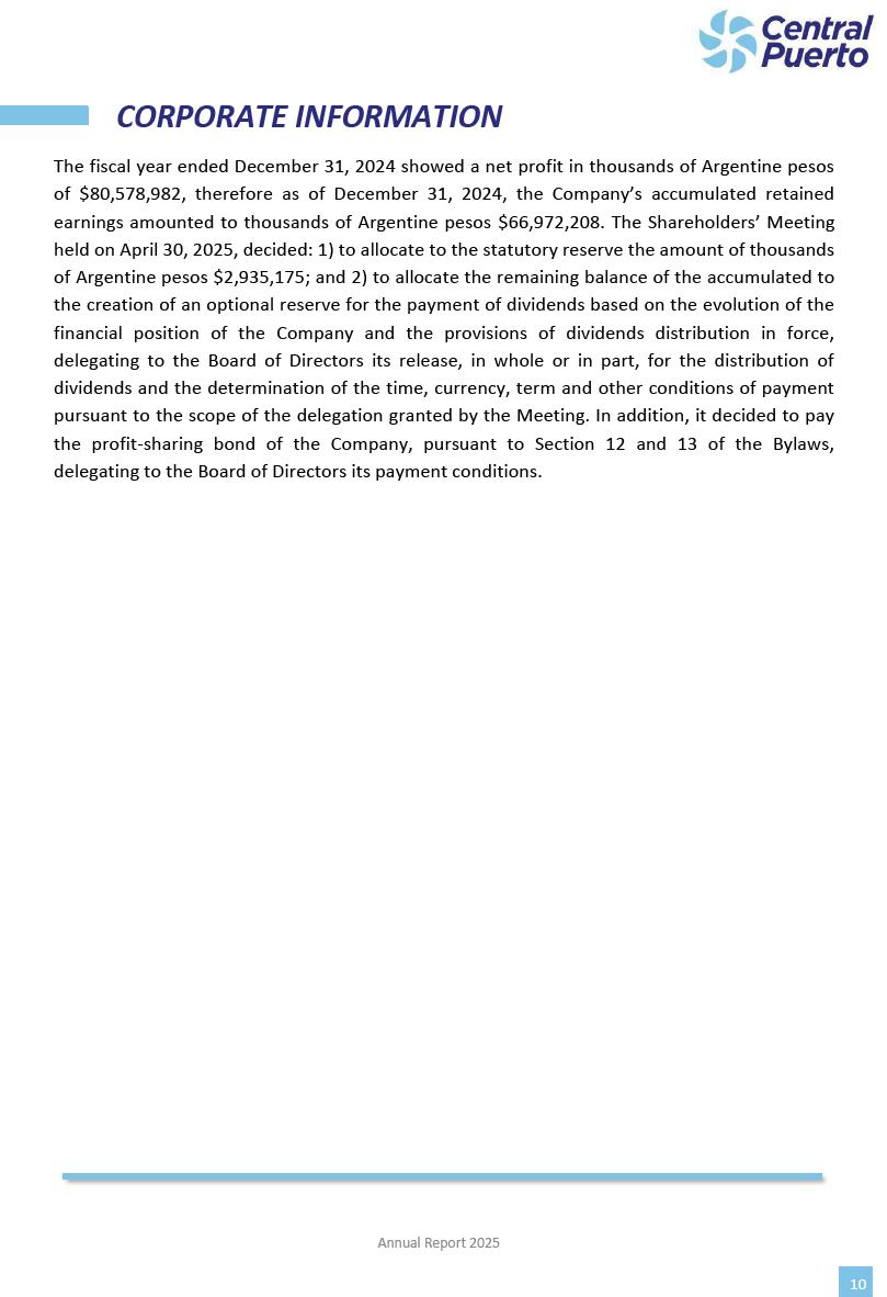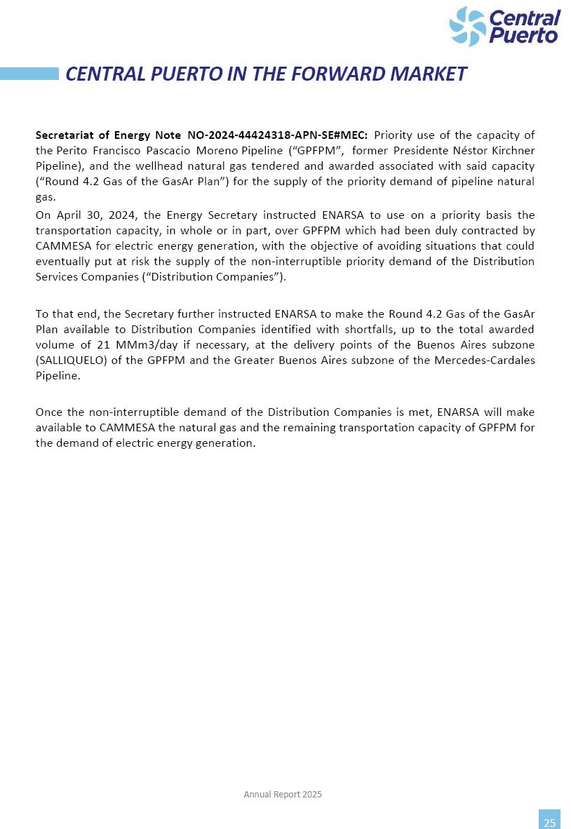 Annual Report Central Puerto December 2025 2 CONTENT 1. Company’s overview Corporate Governance Board of Directors, Statutory Audit Committee and Supervisory Committee Corporate information 2. Macroeconomic context 3. The Argentine Wholesale Electricity Market Trade Agreements in the forward market Liquid fuels and natural gas 4. Maintenance Puerto Nuevo & Nuevo Puerto Site Mendoza Piedra del Águila Site Brigadier López Site San Lorenzo Site – Terminal 6 5. Human Resource 6. Environment, Health & Safety and Quality Commitment Policy Environment Health & Safety Quality 7. Finances General remarks Outlook for the current fiscal year Allocation of fiscal year results Financial performance 01 Company’s overview CORPORATE GOVERNANCE Annual Report 2025 4 Directors Osvaldo Arturo RECA (Chairman) Miguel DODERO (Vice-Chairman) José Luis MOREA Tomás José WHITE Marcelo Atilio SUVA Jorge Eduardo VILLEGAS Martina BLANCO Diego Gustavo PETRACCHI Martín LHEZ Deputy Directors Fernando Roberto BONNET José Manuel ORTIZ Adrián Gustavo SALVATORE Martín OROZCO Mario ELIZALDE José Manuel PAZOS Alejo VILLEGAS Ramón Nazareno ULLOA CORPORATE GOVERNANCE Annual Report 2025 5 STATUTORY AUDIT COMMITTEE Statutory Auditors Carlos César Adolfo HALLADJIAN Eduardo Antonio EROSA Juan Antonio NICHOLSON Deputy Statutory Auditors Carlos Adolfo ZLOTNITZKY Cristina Margarita DE GIORGIO Lucas NICHOLSON SUPERVISORY COMMITTEE Members José Luis MOREA Tomás José WHITE (financial expert) Jorge Eduardo VILLEGAS Deputy members Juan Manuel ORTIZ Mario ELIZALDE Annual Report 2025 6 CORPORATE INFORMATION Central Puerto S.A. (the “Company” or “CPSA”) and the companies that make up the economic group (the “Group”) form an integrated group of companies related to the energy sector, mainly engaged in electric power generation and trade. CPSA was incorporated pursuant to the Executive Power (“PEN”) Decree No. 122/92, in accordance with Law No. 24065, which subjected to total privatization the electricity generation, transportation, distribution and trade in charge of Servicios Eléctricos del Gran Buenos Aires S.A. Our shares are listed on Bolsas y Mercados Argentinos (“BYMA”) and, since February 1, 2018, on the NYSE (“New York Stock Exchange”), under the ticker “CEPU”. The Company has the following assets to conduct its electric power generation activity: THERMAL AND HYDROELECTRIC POWER STATIONS (*) ST 140 MW with Commercial Authorization expected for 2026 Luján de Cuyo Thermal Station has a capacity of 125 tn/h of steam production and Terminal 6 – San Lorenzo Cogeneration Thermal Station has a steam production capacity of 340 tn/h. Annual Report 2025 7 CORPORATE INFORMATION The Company has a total installed capacity of 568.8 MW of commercially-authorized power from renewable sources, which is distributed as follows: RENEWABLE ENERGY FARMS (*) CPSA’s acquisition of the complex in September 2025 (**) Generation is considered from the Commercial Authorization of the farm in November 2025 Annual Report 2025 8 CORPORATE INFORMATION Central Puerto has shareholdings in three thermal companies: INVESTEES Annual Report 2025 9 CORPORATE INFORMATION ✓ On July 19, 2028, Ente Nacional Regulador del Gas (Enargas, Argentine Gas Regulating Entity) registered the Company in the Traders and Trade Agreements Register of Enargas. ✓ The company Puerto Energia S.A.U. (completely controlled by CPSA), was registered as trader of natural gas in the Traders Register of Enargas on March 22, 2024, and on September 20, 2024 its entry as Trader Participant in Wholesale Electricity Market (WEM) was authorized. ✓ On March 31, 2025, CPSA’s Board of Directors approved a corporate reorganization by which, subject to the approval of the Shareholders’ Meetings of the companies involved, CPSA absorbed the assets and liabilities of the subsidiary CPR. Since CPSA owned 100% of CPR’s shares, its equity did not increase as a result of the merger. Subsidiary CPR will be dissolved without liquidation. On May 22, 2025, the corresponding Shareholders’ Meetings approved the corporate reorganization. The merger’s effective date was defined to be October 1, 2025, once all the conditions established in the Merger Final Agreement were met and after the approval of the corporate reorganization by CNV, which occurred on September 10, 2025. ✓ Regarding the mining sector, the Company has a shareholding of: a) 9.9% in AbraSilver Resource Corp. (“AbraSilver”), a company listed on the Canadian Stock Exchange with mining concessions in Argentina, which includes the silver-gold project Diablillos, located in the Northwest area of Argentina, on the limit between the provinces of Salta and Catamarca, and b) 27.5% of the share capital of 3C Lithium Pte. Ltd. (“3C”) (incorporated under the regulations of Singapore), which owns 100% of the share capital of Minera Cordillera S.A., an Argentine company owning the mining rights of the project “Tres Cruces”, located in Catamarca, Argentina. The project “Tres Cruces” involves a recently-discovered lithium deposit, with the aim of developing exploring, drilling and exploitation activities of the mineral. ✓ The Group participates in the forestry sector with assets in the provinces of Entre Ríos and Corrientes, through the following subsidiaries of Proener S.A.U (a company completely owned by CPSA): a) Forestal Argentina S.A., owner of forestry assets consisting of approximately 141,000 hectares in the provinces of Entre Ríos and Corrientes, of which 67,000 hectares are planted with eucalyptus and pine, over a total of 77,500 arable hectares; and b) Loma Alta Forestal S.A., owner of forestry assets consisting of approximately 19,400 hectares in the province of Corrientes, of which approximately 10,400 hectares are planted with pine. Annual Report 2025 10 CORPORATE INFORMATION ✓ Finally, the Group was involved in the natural gas distribution sector in the regions of Cuyo 