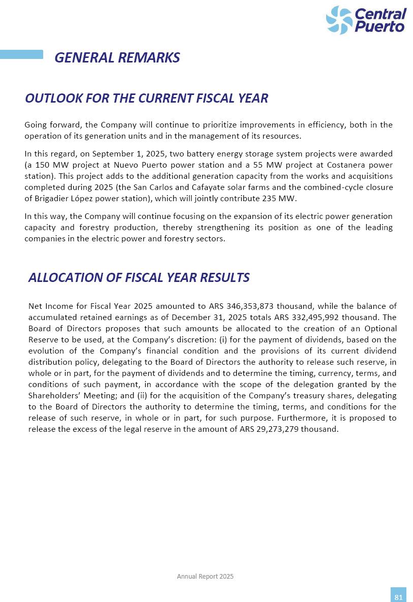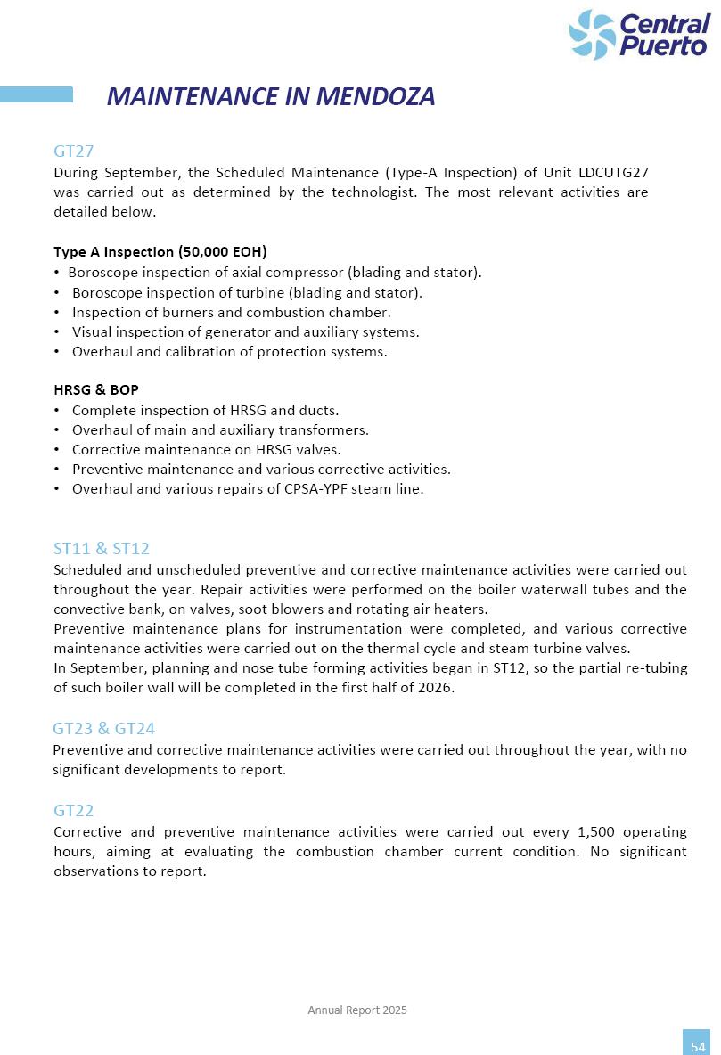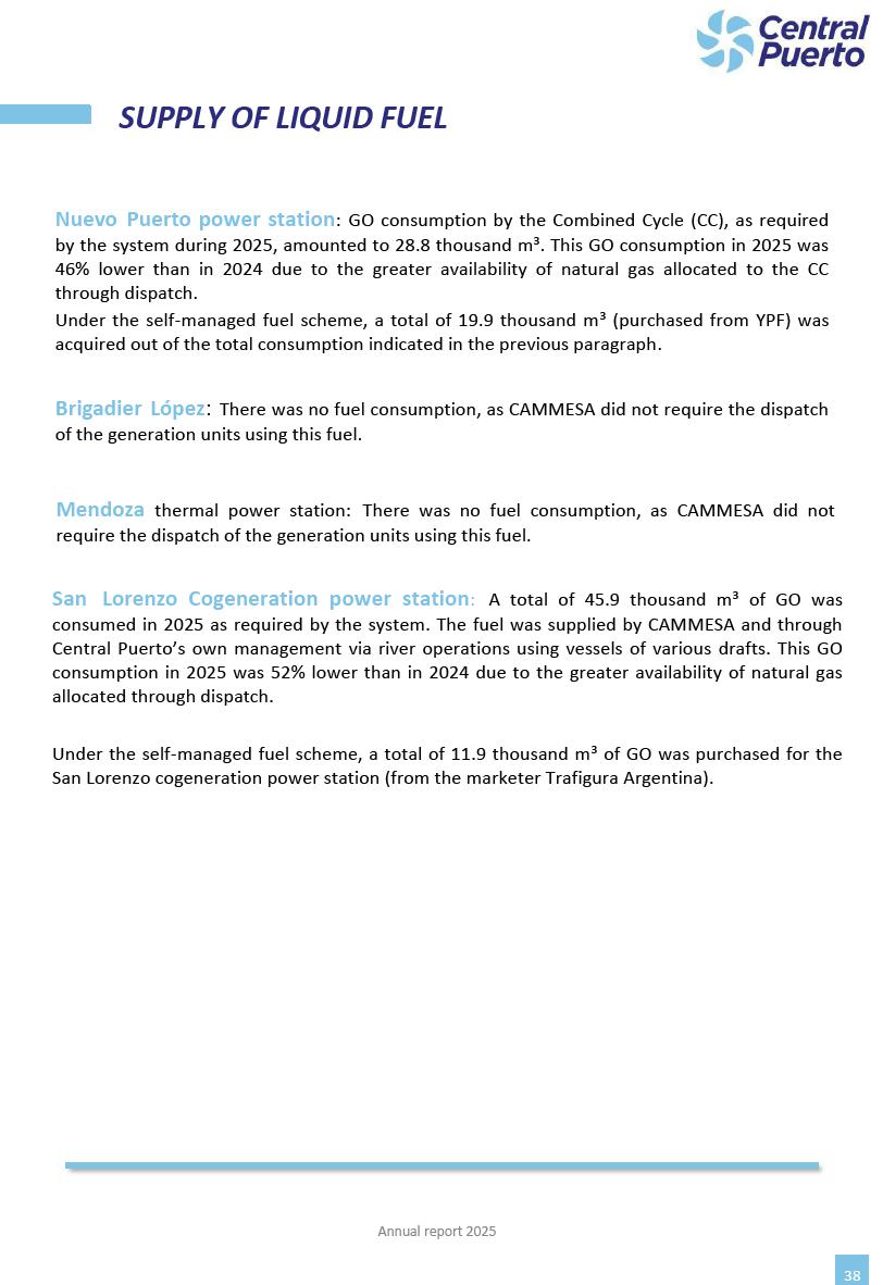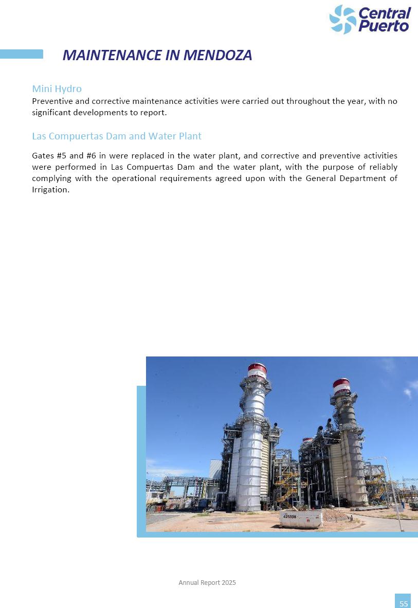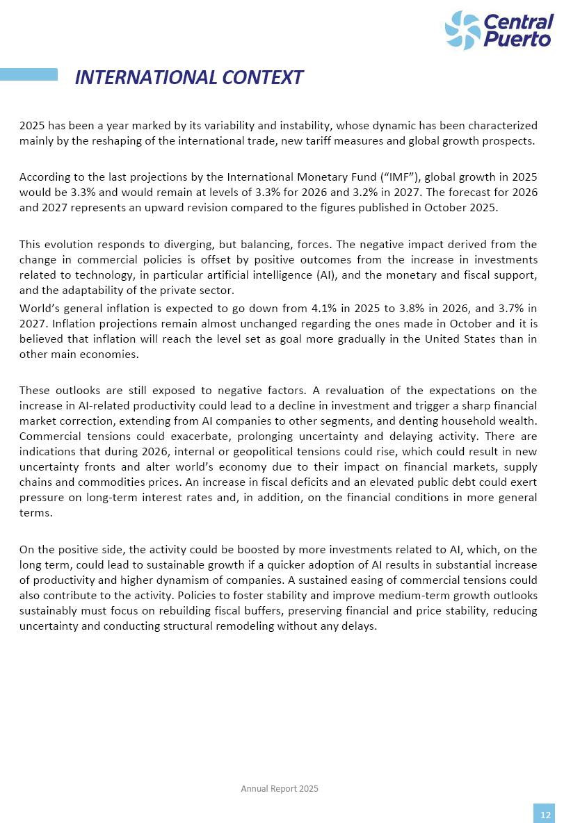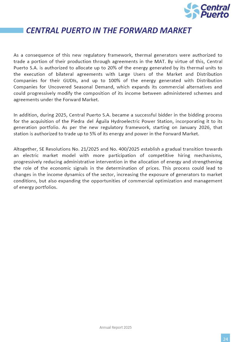 Annual Report Central Puerto December 2025 2 CONTENT 1. Company’s overview Corporate Governance Board of Directors, Statutory Audit Committee and Supervisory Committee Corporate information 2. Macroeconomic context 3. The Argentine Wholesale Electricity Market Trade Agreements in the forward market Liquid fuels and natural gas 4. Maintenance Puerto Nuevo & Nuevo Puerto Site Mendoza Piedra del Águila Site Brigadier López Site San Lorenzo Site – Terminal 6 5. Human Resource 6. Environment, Health & Safety and Quality Commitment Policy Environment Health & Safety Quality 7. Finances General remarks Outlook for the current fiscal year Allocation of fiscal year results Financial performance 01 Company’s overview CORPORATE GOVERNANCE Annual Report 2025 4 Directors Osvaldo Arturo RECA (Chairman) Miguel DODERO (Vice-Chairman) José Luis MOREA Tomás José WHITE Marcelo Atilio SUVA Jorge Eduardo VILLEGAS Martina BLANCO Diego Gustavo PETRACCHI Martín LHEZ Deputy Directors Fernando Roberto BONNET José Manuel ORTIZ Adrián Gustavo SALVATORE Martín OROZCO Mario ELIZALDE José Manuel PAZOS Alejo VILLEGAS Ramón Nazareno ULLOA CORPORATE GOVERNANCE Annual Report 2025 5 STATUTORY AUDIT COMMITTEE Statutory Auditors Carlos César Adolfo HALLADJIAN Eduardo Antonio EROSA Juan Antonio NICHOLSON Deputy Statutory Auditors Carlos Adolfo ZLOTNITZKY Cristina Margarita DE GIORGIO Lucas NICHOLSON SUPERVISORY COMMITTEE Members José Luis MOREA Tomás José WHITE (financial expert) Jorge Eduardo VILLEGAS Deputy members Juan Manuel ORTIZ Mario ELIZALDE Annual Report 2025 6 CORPORATE INFORMATION Central Puerto S.A. (the “Company” or “CPSA”) and the companies that make up the economic group (the “Group”) form an integrated group of companies related to the energy sector, mainly engaged in electric power generation and trade. CPSA was incorporated pursuant to the Executive Power (“PEN”) Decree No. 122/92, in accordance with Law No. 24065, which subjected to total privatization the electricity generation, transportation, distribution and trade in charge of Servicios Eléctricos del Gran Buenos Aires S.A. Our shares are listed on Bolsas y Mercados Argentinos (“BYMA”) and, since February 1, 2018, on the NYSE (“New York Stock Exchange”), under the ticker “CEPU”. The Company has the following assets to conduct its electric power generation activity: THERMAL AND HYDROELECTRIC POWER STATIONS (*) ST 140 MW with Commercial Authorization expected for 2026 Luján de Cuyo Thermal Station has a capacity of 125 tn/h of steam production and Terminal 6 – San Lorenzo Cogeneration Thermal Station has a steam production capacity of 340 tn/h. Annual Report 2025 7 CORPORATE INFORMATION The Company has a total installed capacity of 568.8 MW of commercially-authorized power from renewable sources, which is distributed as follows: RENEWABLE ENERGY FARMS (*) CPSA’s acquisition of the complex in September 2025 (**) Generation is considered from the Commercial Authorization of the farm in November 2025 Annual Report 2025 8 CORPORATE INFORMATION Central Puerto has shareholdings in three thermal companies: INVESTEES Annual Report 2025 9 CORPORATE INFORMATION ✓ On July 19, 2028, Ente Nacional Regulador del Gas (Enargas, Argentine Gas Regulating Entity) registered the Company in the Traders and Trade Agreements Register of Enargas. ✓ The company Puerto Energia S.A.U. (completely controlled by CPSA), was registered as trader of natural gas in the Traders Register of Enargas on March 22, 2024, and on September 20, 2024 its entry as Trader Participant in Wholesale Electricity Market (WEM) was authorized. ✓ On March 31, 2025, CPSA’s Board of Directors approved a corporate reorganization by which, subject to the approval of the Shareholders’ Meetings of the companies involved, CPSA absorbed the assets and liabilities of the subsidiary CPR. Since CPSA owned 100% of CPR’s shares, its equity did not increase as a result of the merger. Subsidiary CPR will be dissolved without liquidation. On May 22, 2025, the corresponding Shareholders’ Meetings approved the corporate reorganization. The merger’s effective date was defined to be October 1, 2025, once all the conditions established in the Merger Final Agreement were met and after the approval of the corporate reorganization by CNV, which occurred on September 10, 2025. ✓ Regarding the mining sector, the Company has a shareholding of: a) 9.9% in AbraSilver Resource Corp. (“AbraSilver”), a company listed on the Canadian Stock Exchange with mining concessions in Argentina, which includes the silver-gold project Diablillos, located in the Northwest area of Argentina, on the limit between the provinces of Salta and Catamarca, and b) 27.5% of the share capital of 3C Lithium Pte. Ltd. (“3C”) (incorporated under the regulations of Singapore), which owns 100% of the share capital of Minera Cordillera S.A., an Argentine company owning the mining rights of the project “Tres Cruces”, located in Catamarca, Argentina. The project “Tres Cruces” involves a recently-discovered lithium deposit, with the aim of developing exploring, drilling and exploitation activities of the mineral. ✓ The Group participates in the forestry sector with assets in the provinces of Entre Ríos and Corrientes, through the following subsidiaries of Proener S.A.U (a company completely owned by CPSA): a) Forestal Argentina S.A., owner of forestry assets consisting of approximately 141,000 hectares in the provinces of Entre Ríos and Corrientes, of which 67,000 hectares are planted with eucalyptus and pine, over a total of 77,500 arable hectares; and b) Loma Alta Forestal S.A., owner of forestry assets consisting of approximately 19,400 hectares in the province of Corrientes, of which approximately 10,400 hectares are planted with pine. Annual Report 2025 10 CORPORATE INFORMATION ✓ Finally, the Group was involved in the natural gas distribution sector in the regions of Cuyo 