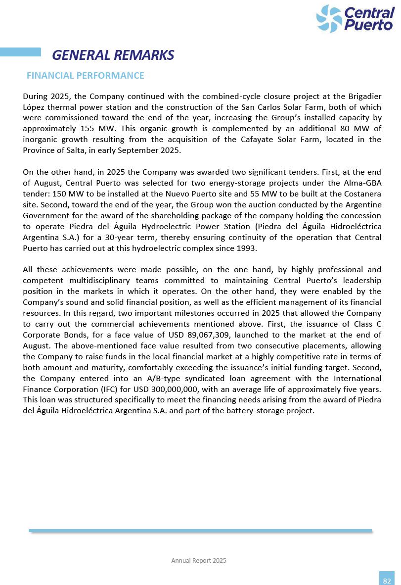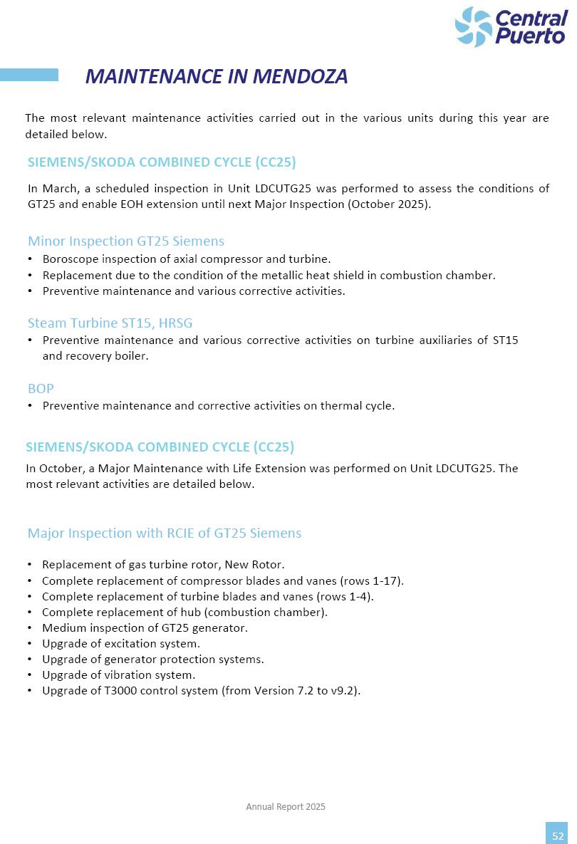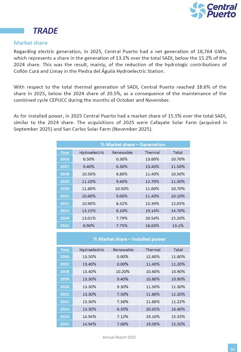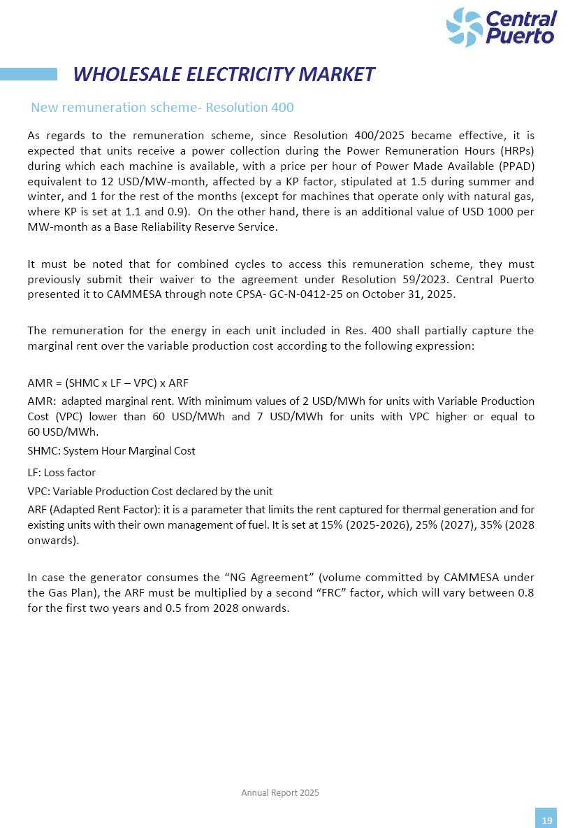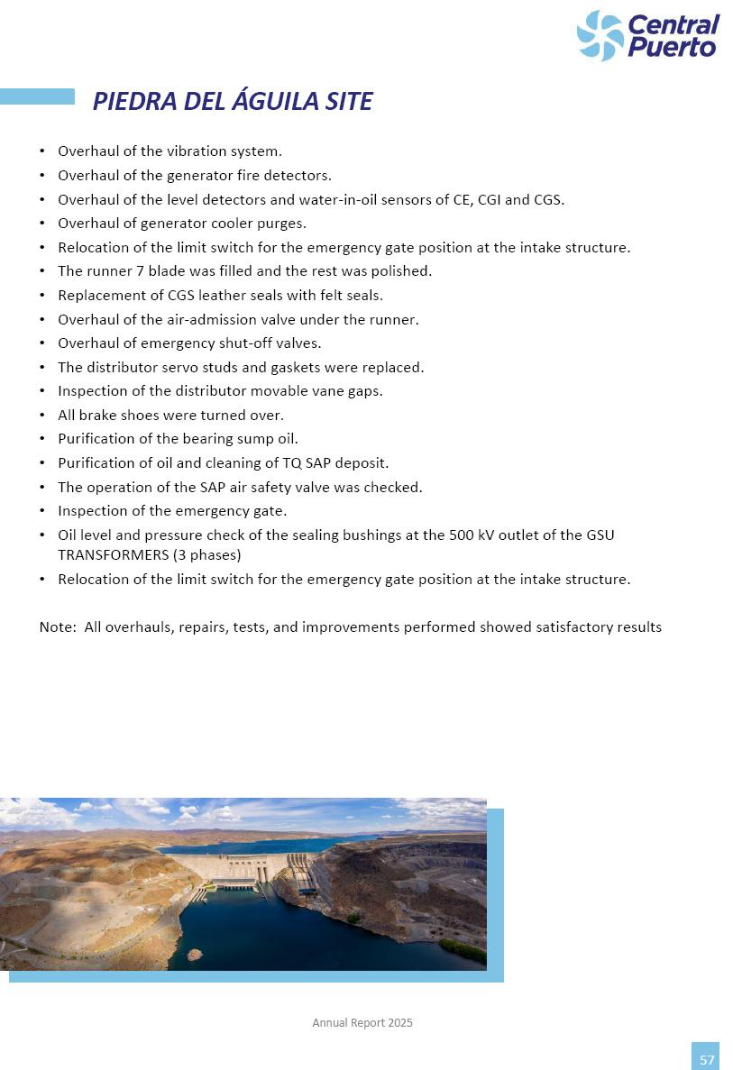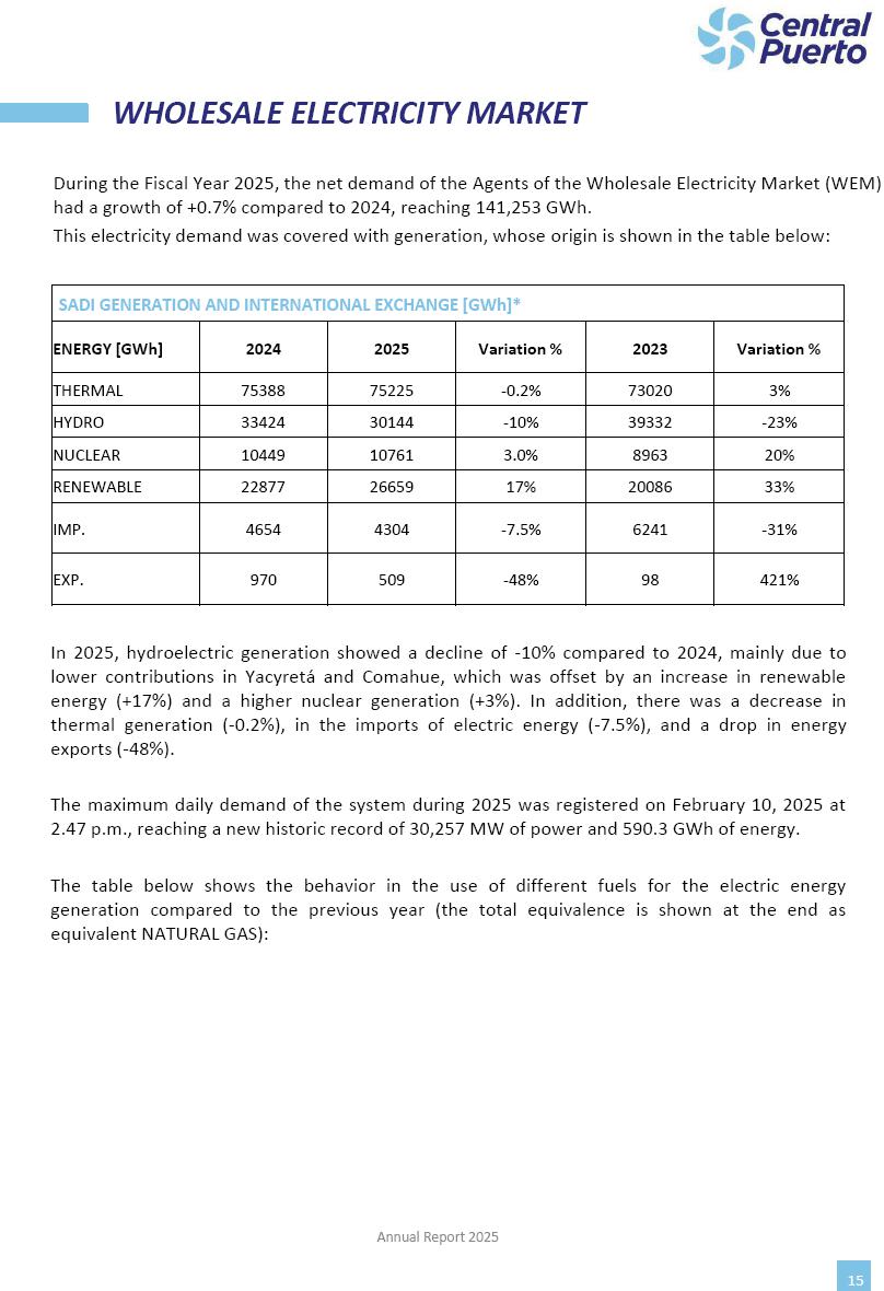 Annual Report Central Puerto December 2025 2 CONTENT 1. Company’s overview Corporate Governance Board of Directors, Statutory Audit Committee and Supervisory Committee Corporate information 2. Macroeconomic context 3. The Argentine Wholesale Electricity Market Trade Agreements in the forward market Liquid fuels and natural gas 4. Maintenance Puerto Nuevo & Nuevo Puerto Site Mendoza Piedra del Águila Site Brigadier López Site San Lorenzo Site – Terminal 6 5. Human Resource 6. Environment, Health & Safety and Quality Commitment Policy Environment Health & Safety Quality 7. Finances General remarks Outlook for the current fiscal year Allocation of fiscal year results Financial performance 01 Company’s overview CORPORATE GOVERNANCE Annual Report 2025 4 Directors Osvaldo Arturo RECA (Chairman) Miguel DODERO (Vice-Chairman) José Luis MOREA Tomás José WHITE Marcelo Atilio SUVA Jorge Eduardo VILLEGAS Martina BLANCO Diego Gustavo PETRACCHI Martín LHEZ Deputy Directors Fernando Roberto BONNET José Manuel ORTIZ Adrián Gustavo SALVATORE Martín OROZCO Mario ELIZALDE José Manuel PAZOS Alejo VILLEGAS Ramón Nazareno ULLOA CORPORATE GOVERNANCE Annual Report 2025 5 STATUTORY AUDIT COMMITTEE Statutory Auditors Carlos César Adolfo HALLADJIAN Eduardo Antonio EROSA Juan Antonio NICHOLSON Deputy Statutory Auditors Carlos Adolfo ZLOTNITZKY Cristina Margarita DE GIORGIO Lucas NICHOLSON SUPERVISORY COMMITTEE Members José Luis MOREA Tomás José WHITE (financial expert) Jorge Eduardo VILLEGAS Deputy members Juan Manuel ORTIZ Mario ELIZALDE Annual Report 2025 6 CORPORATE INFORMATION Central Puerto S.A. (the “Company” or “CPSA”) and the companies that make up the economic group (the “Group”) form an integrated group of companies related to the energy sector, mainly engaged in electric power generation and trade. CPSA was incorporated pursuant to the Executive Power (“PEN”) Decree No. 122/92, in accordance with Law No. 24065, which subjected to total privatization the electricity generation, transportation, distribution and trade in charge of Servicios Eléctricos del Gran Buenos Aires S.A. Our shares are listed on Bolsas y Mercados Argentinos (“BYMA”) and, since February 1, 2018, on the NYSE (“New York Stock Exchange”), under the ticker “CEPU”. The Company has the following assets to conduct its electric power generation activity: THERMAL AND HYDROELECTRIC POWER STATIONS (*) ST 140 MW with Commercial Authorization expected for 2026 Luján de Cuyo Thermal Station has a capacity of 125 tn/h of steam production and Terminal 6 – San Lorenzo Cogeneration Thermal Station has a steam production capacity of 340 tn/h. Annual Report 2025 7 CORPORATE INFORMATION The Company has a total installed capacity of 568.8 MW of commercially-authorized power from renewable sources, which is distributed as follows: RENEWABLE ENERGY FARMS (*) CPSA’s acquisition of the complex in September 2025 (**) Generation is considered from the Commercial Authorization of the farm in November 2025 Annual Report 2025 8 CORPORATE INFORMATION Central Puerto has shareholdings in three thermal companies: INVESTEES Annual Report 2025 9 CORPORATE INFORMATION ✓ On July 19, 2028, Ente Nacional Regulador del Gas (Enargas, Argentine Gas Regulating Entity) registered the Company in the Traders and Trade Agreements Register of Enargas. ✓ The company Puerto Energia S.A.U. (completely controlled by CPSA), was registered as trader of natural gas in the Traders Register of Enargas on March 22, 2024, and on September 20, 2024 its entry as Trader Participant in Wholesale Electricity Market (WEM) was authorized. ✓ On March 31, 2025, CPSA’s Board of Directors approved a corporate reorganization by which, subject to the approval of the Shareholders’ Meetings of the companies involved, CPSA absorbed the assets and liabilities of the subsidiary CPR. Since CPSA owned 100% of CPR’s shares, its equity did not increase as a result of the merger. Subsidiary CPR will be dissolved without liquidation. On May 22, 2025, the corresponding Shareholders’ Meetings approved the corporate reorganization. The merger’s effective date was defined to be October 1, 2025, once all the conditions established in the Merger Final Agreement were met and after the approval of the corporate reorganization by CNV, which occurred on September 10, 2025. ✓ Regarding the mining sector, the Company has a shareholding of: a) 9.9% in AbraSilver Resource Corp. (“AbraSilver”), a company listed on the Canadian Stock Exchange with mining concessions in Argentina, which includes the silver-gold project Diablillos, located in the Northwest area of Argentina, on the limit between the provinces of Salta and Catamarca, and b) 27.5% of the share capital of 3C Lithium Pte. Ltd. (“3C”) (incorporated under the regulations of Singapore), which owns 100% of the share capital of Minera Cordillera S.A., an Argentine company owning the mining rights of the project “Tres Cruces”, located in Catamarca, Argentina. The project “Tres Cruces” involves a recently-discovered lithium deposit, with the aim of developing exploring, drilling and exploitation activities of the mineral. ✓ The Group participates in the forestry sector with assets in the provinces of Entre Ríos and Corrientes, through the following subsidiaries of Proener S.A.U (a company completely owned by CPSA): a) Forestal Argentina S.A., owner of forestry assets consisting of approximately 141,000 hectares in the provinces of Entre Ríos and Corrientes, of which 67,000 hectares are planted with eucalyptus and pine, over a total of 77,500 arable hectares; and b) Loma Alta Forestal S.A., owner of forestry assets consisting of approximately 19,400 hectares in the province of Corrientes, of which approximately 10,400 hectares are planted with pine. Annual Report 2025 10 CORPORATE INFORMATION ✓ Finally, the Group was involved in the natural gas distribution sector in the regions of Cuyo 